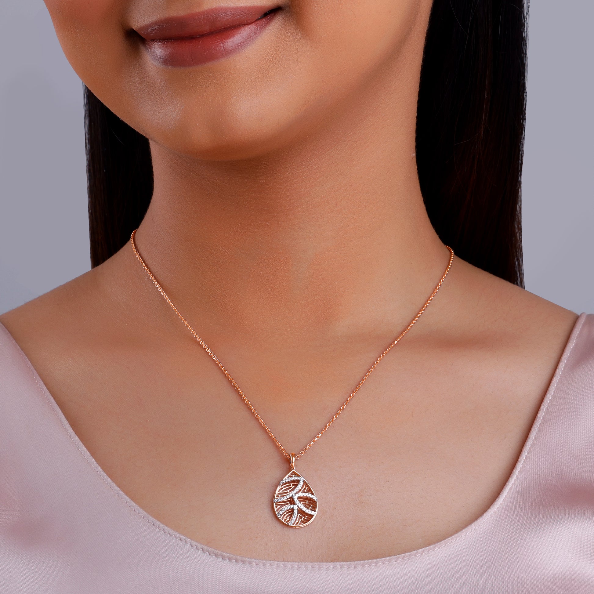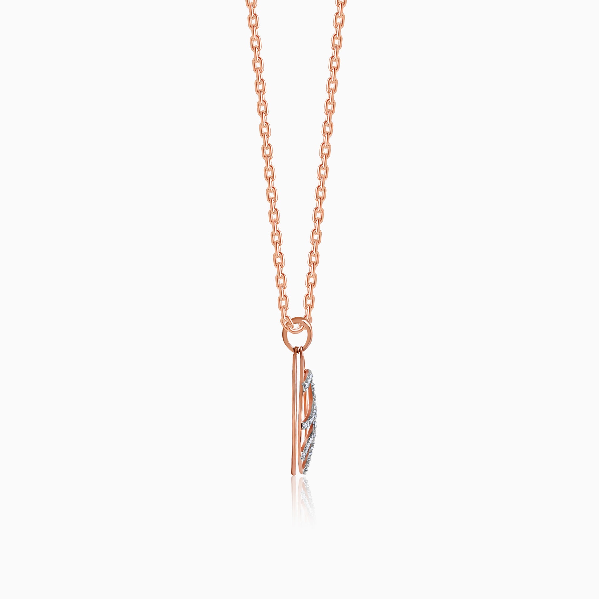 This pure rose gold pendant for women features an openwork leaf motif in sparkling lab grown diamonds that meets a bold, maze-like rose gold backdrop. Together, they create a striking contrast of flow and structure.