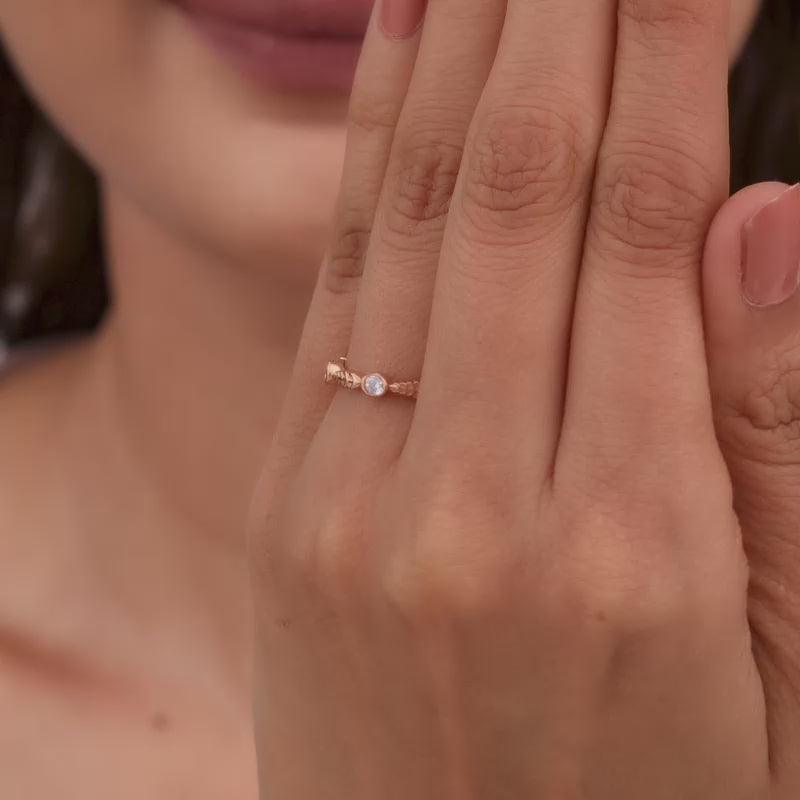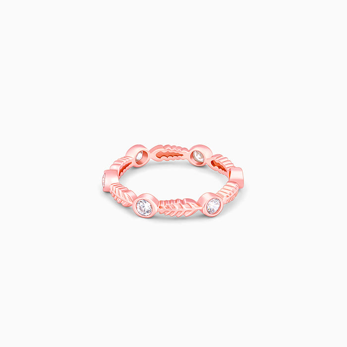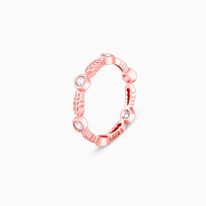 This rose gold ring features oval zircon motifs alternating with long leaf motifs.
