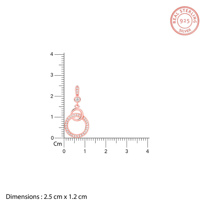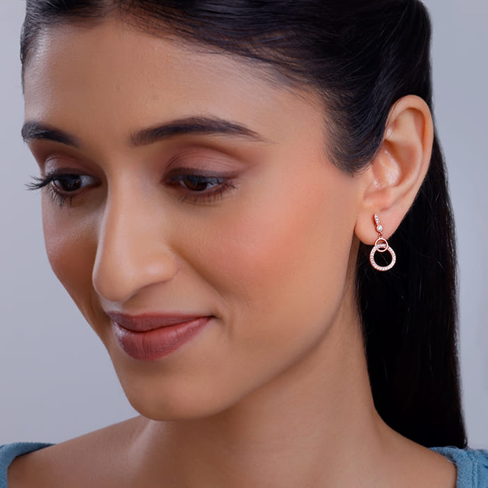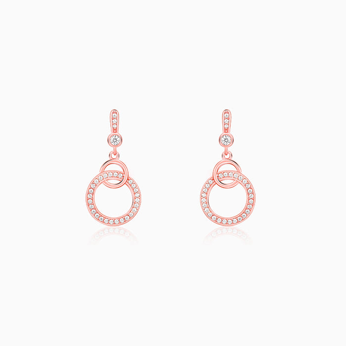 This pair of rose gold dangler earrings feature a circle within a circle design with one of them studded with zircons.