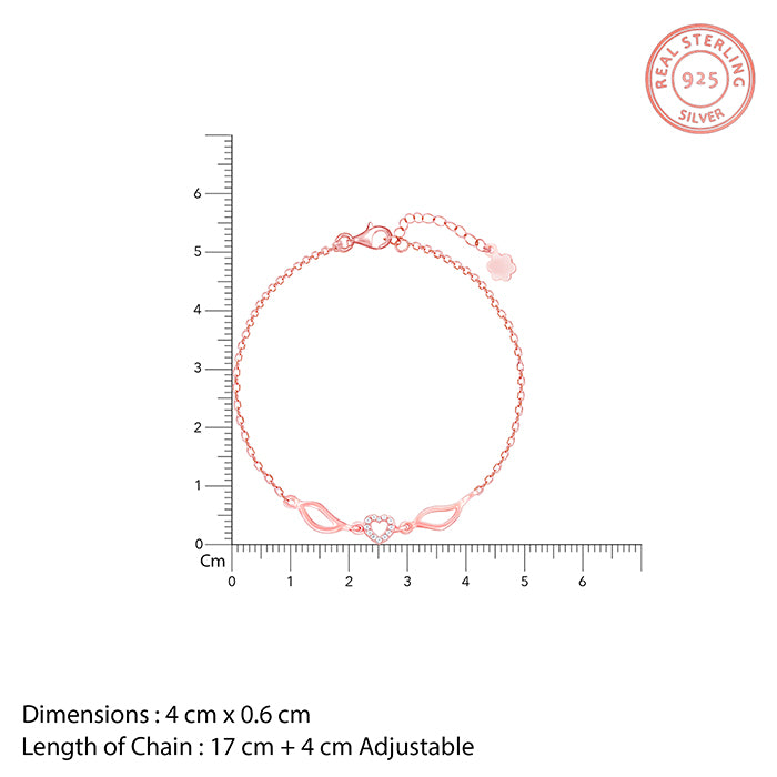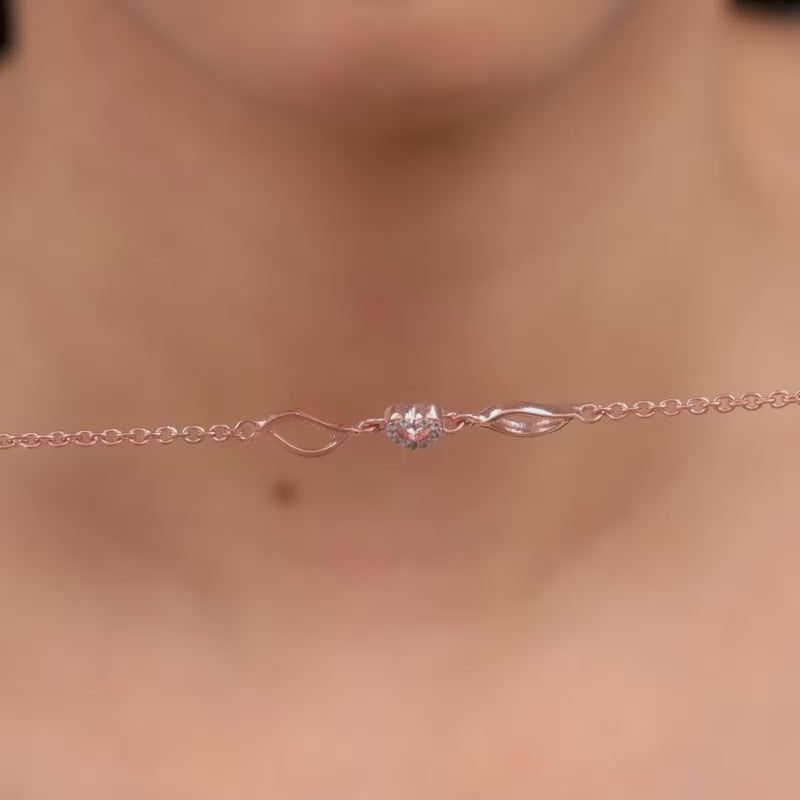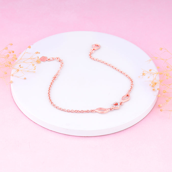 This rose gold bracelet has a zircon studded heart motif in the centre and two leaves at either end.