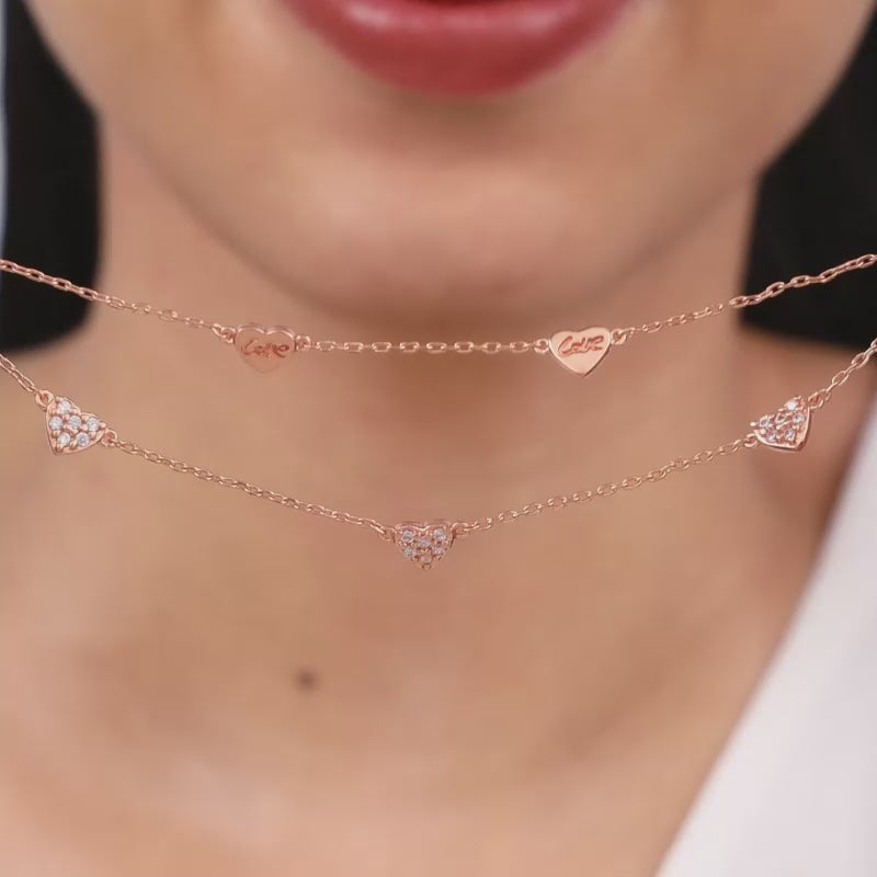 This rose gold bracelet features two layers, one with engraved heart designs and the other with zircon studded heart designs, all equally spaced.
