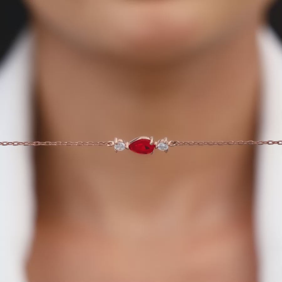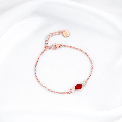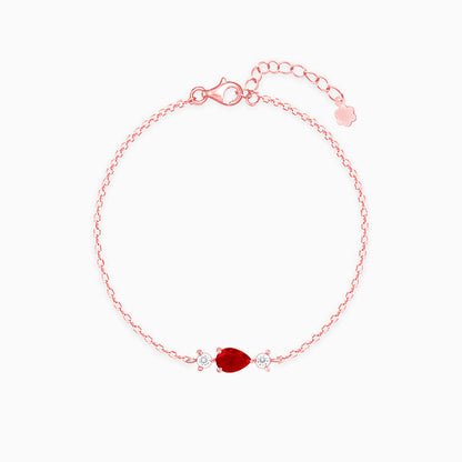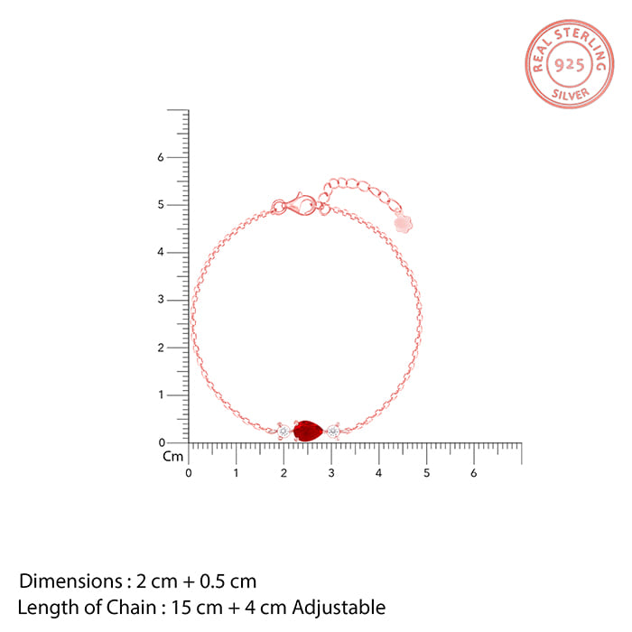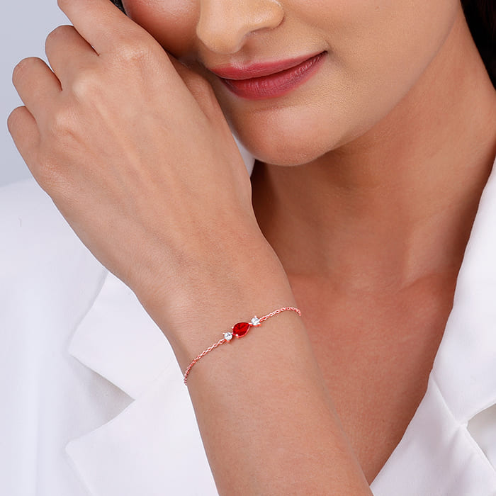 This rose gold bracelet features three pear-shaped motifs attached. The centre motif boasts a red-coloured stone, while the other two showcase zircons. Celebrate your moments of passion with GIVA’s Red Romance Collection.