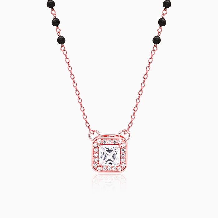 The rose gold mangalsutra features a square charm studded with a big zircon and a classic mangalsutra chain with black beads.