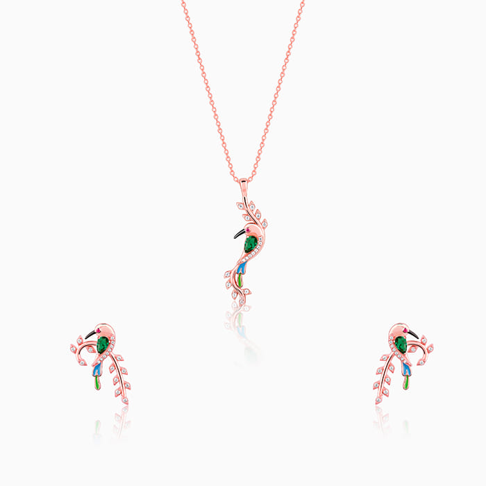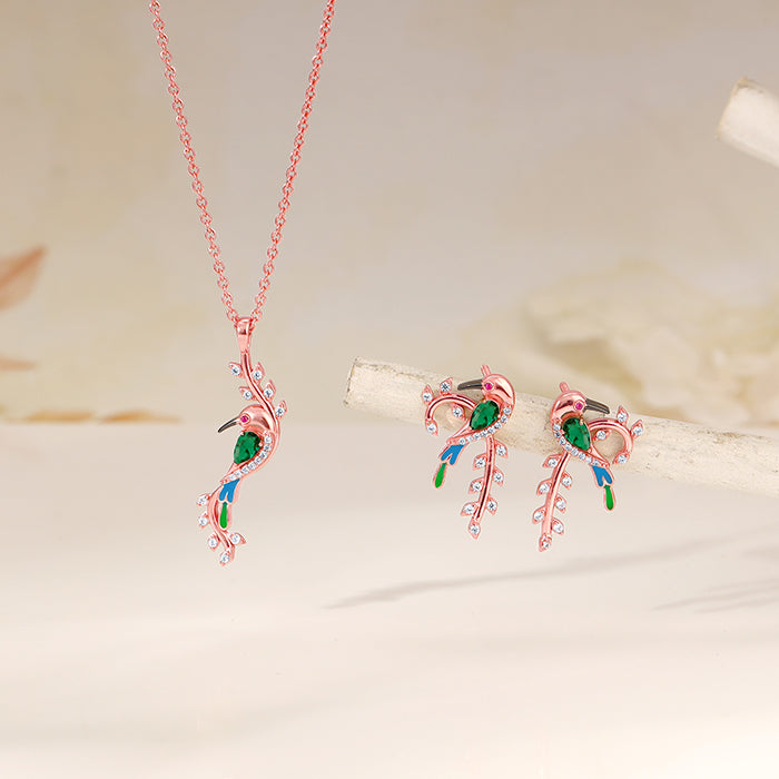This rose gold set has a pendant with link chain and a pair of earrings features a bird with coloured stones, enamel, and zircon. GIVA celebrates the migratory birds that visit India during Summer through our latest colourful collection called Wings of Wonder.