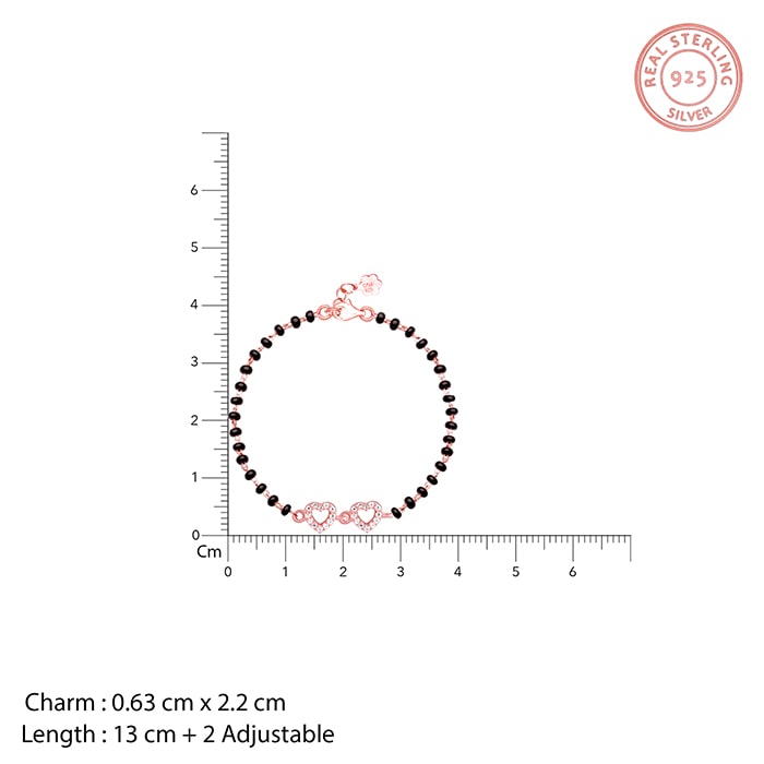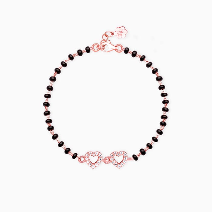The Rose Gold Bracelet has two zircon-studded hearts as the centrepiece on a rose gold chain with black beads.