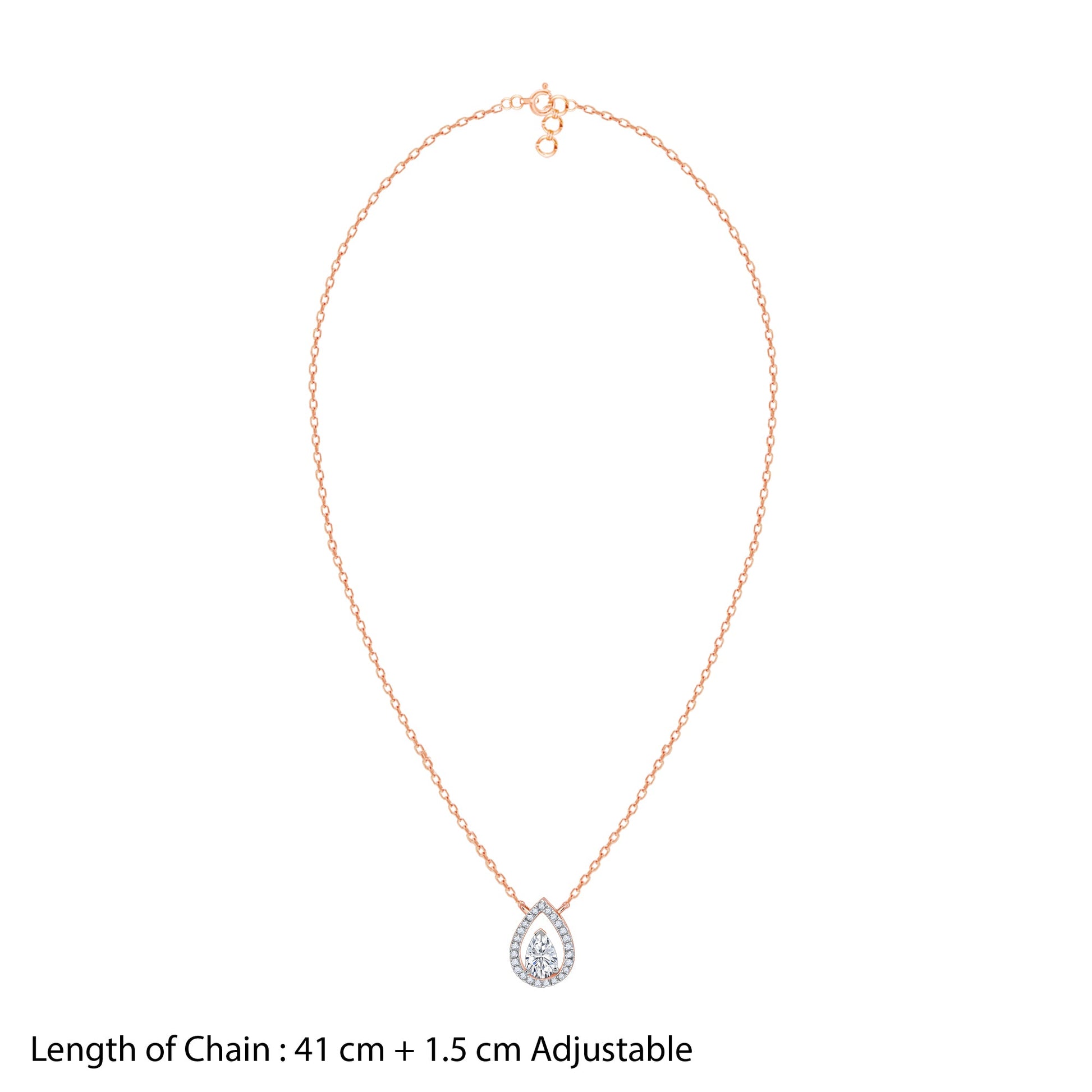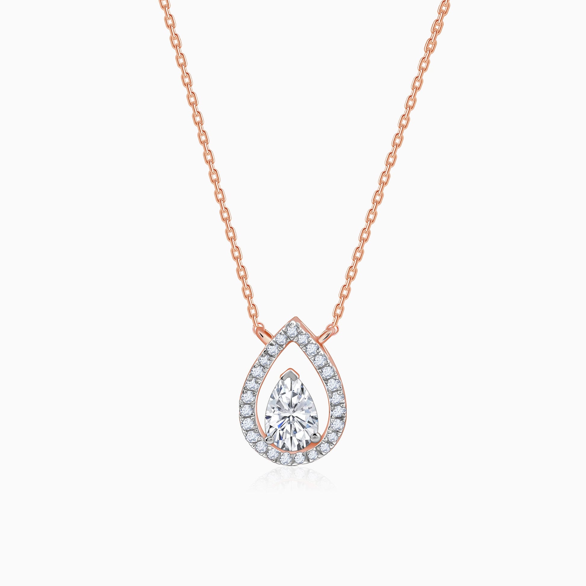 This pure rose gold necklace for women is shaped like a dewdrop with the lining studded with lab grown diamonds. A pear-cut diamond sits elegantly within the design.