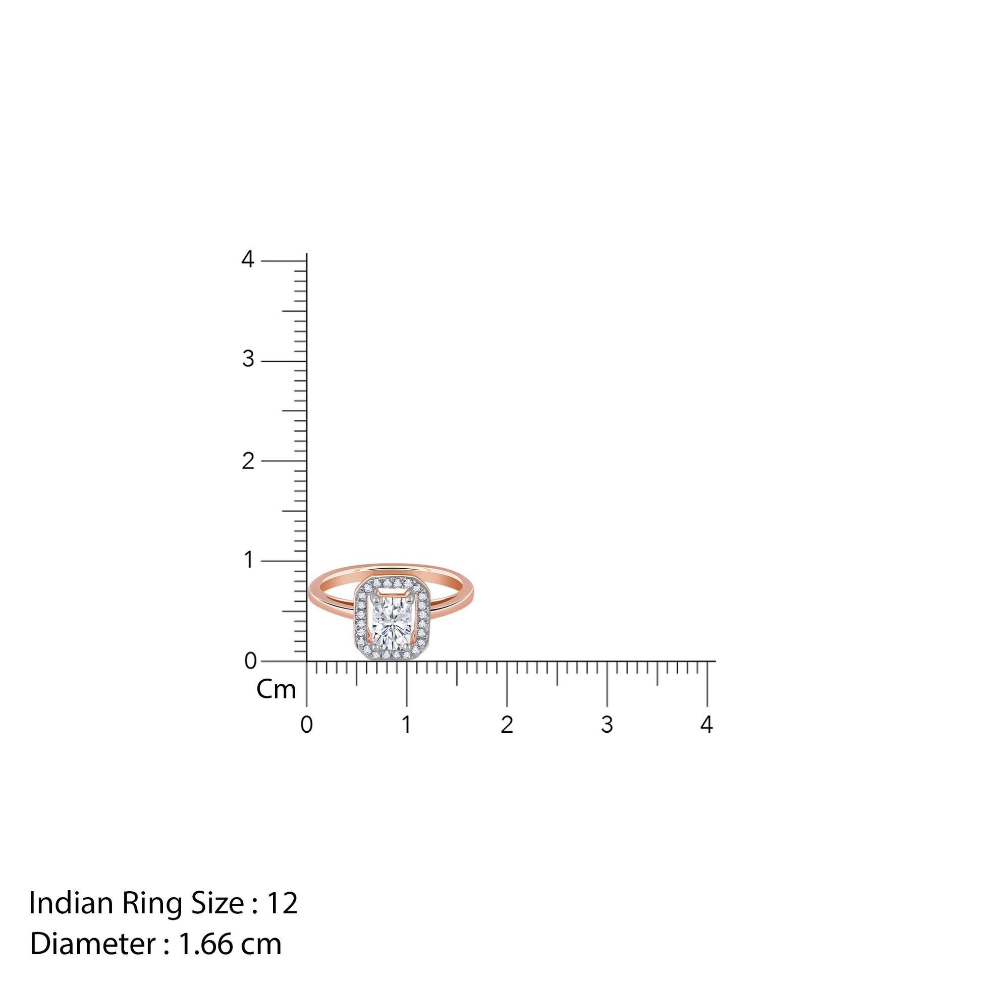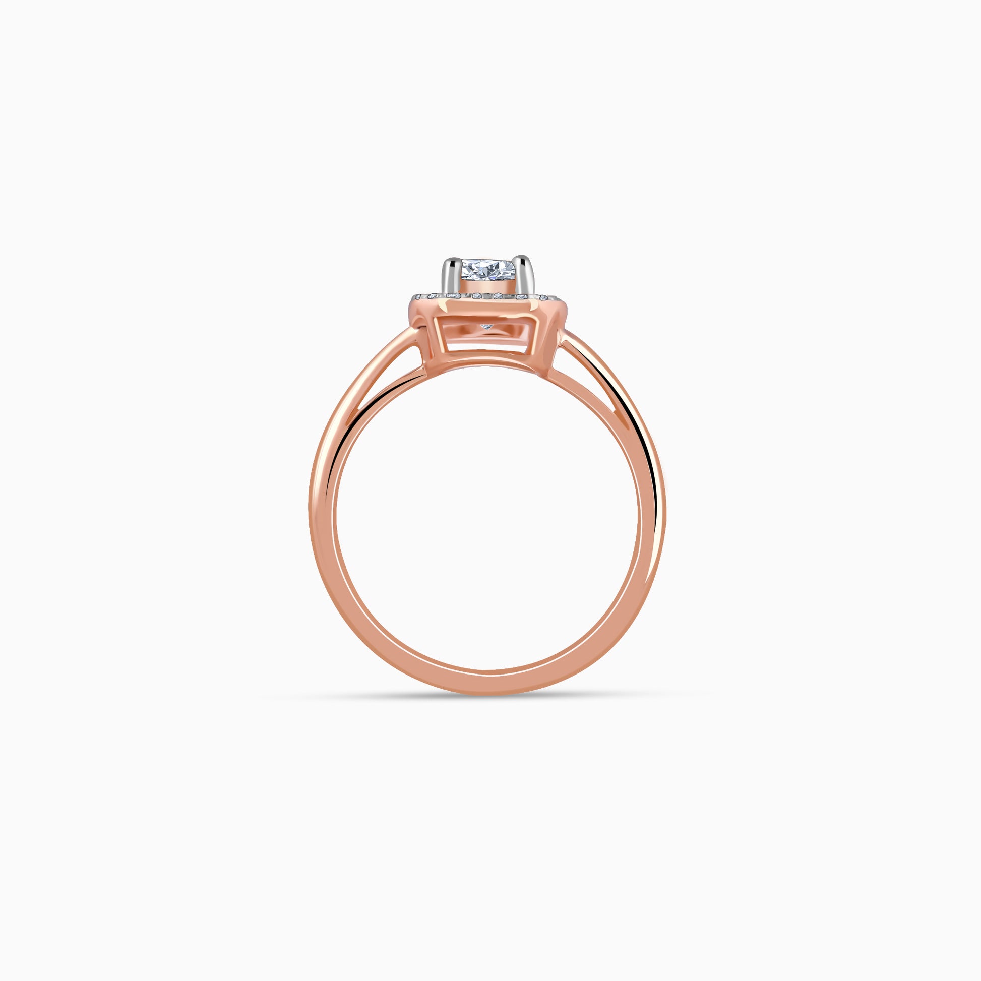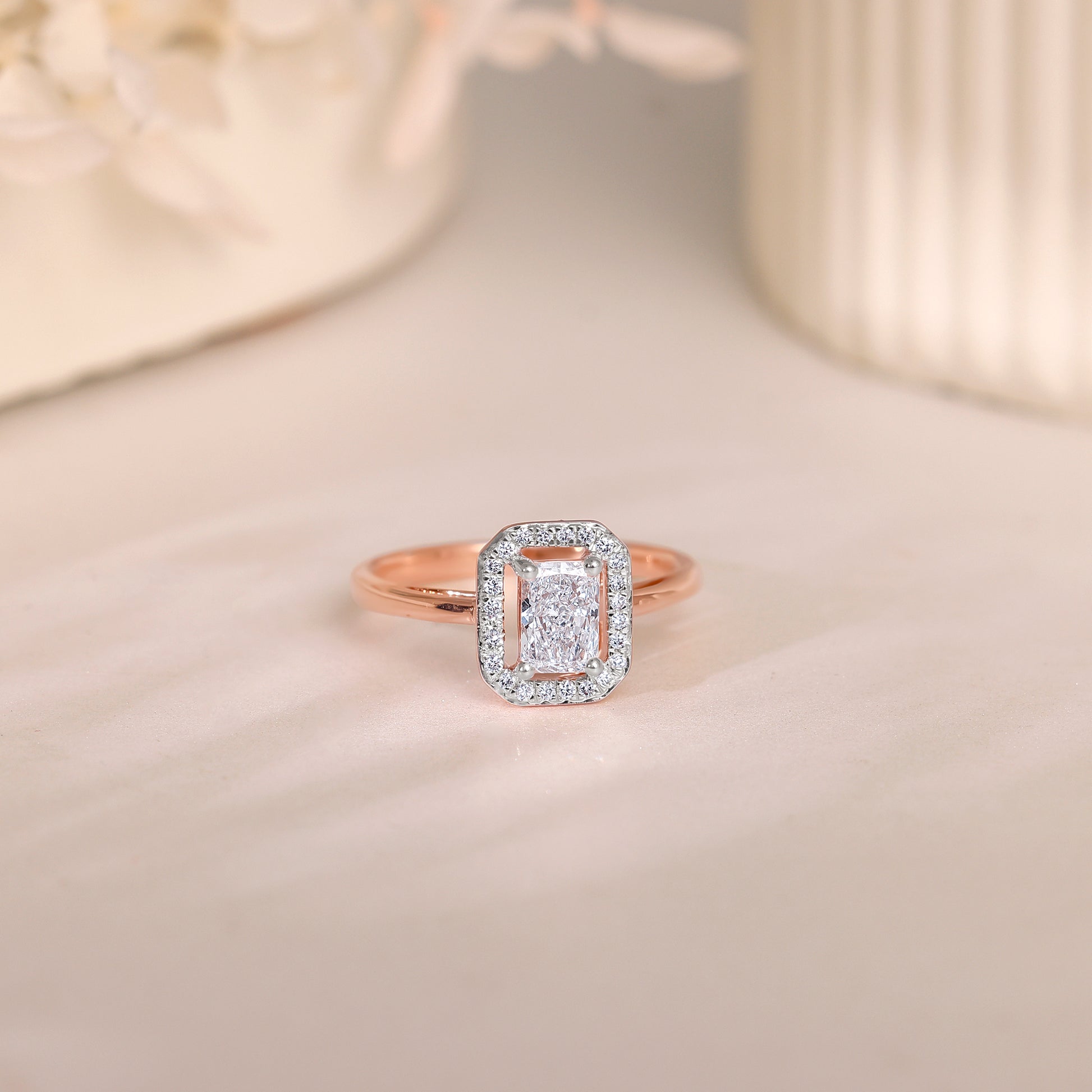 This pure rose gold ring for women showcases a radiant-cut diamond in a halo setting, likely studded with pave-set diamonds. The centre stone is securely held by four prongs.