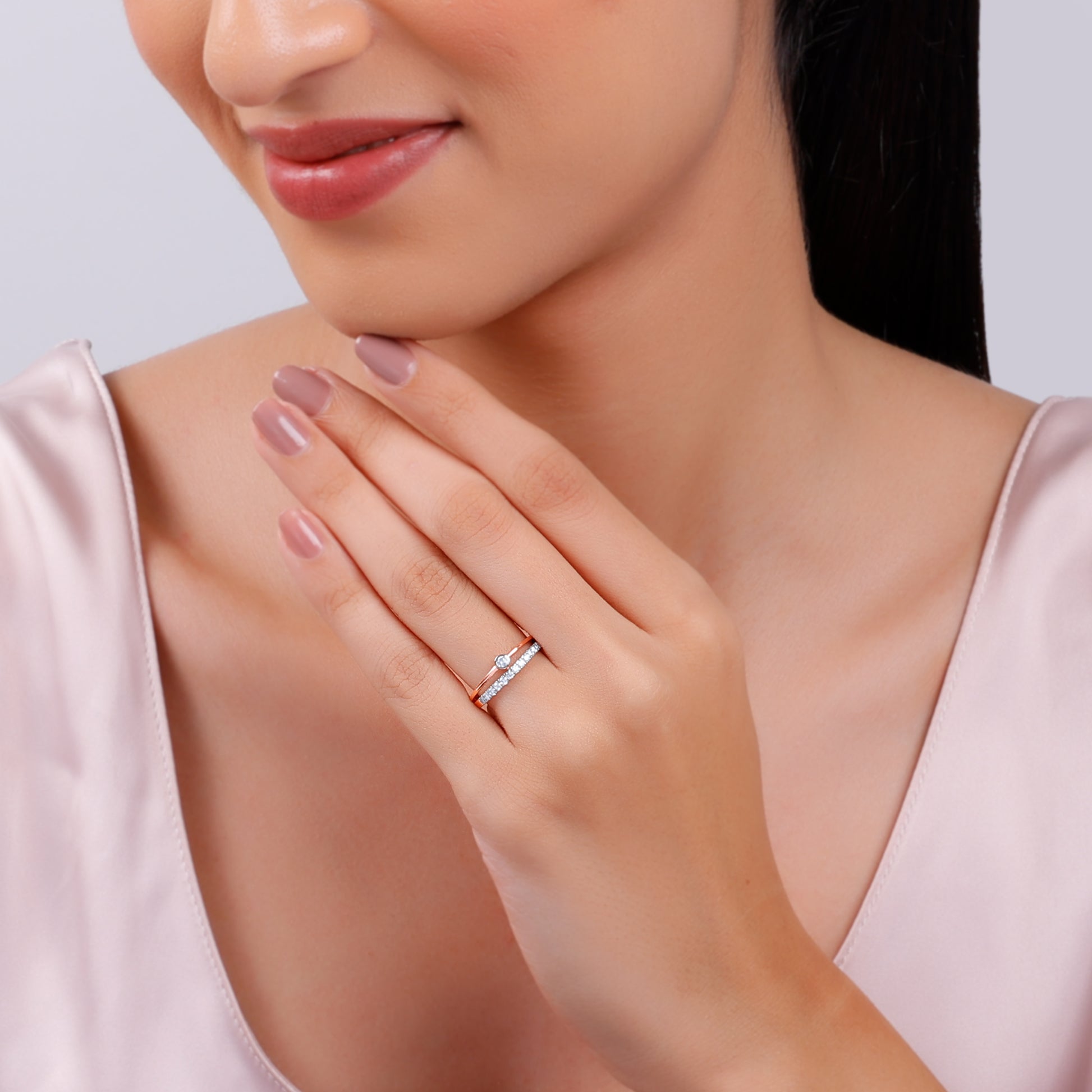 This rose gold ring features a graceful fishtail setting crafted with lab grown diamonds. The gold band curves upward, culminating in a single lab grown diamond that draws the eye.