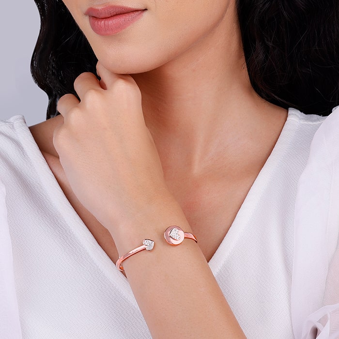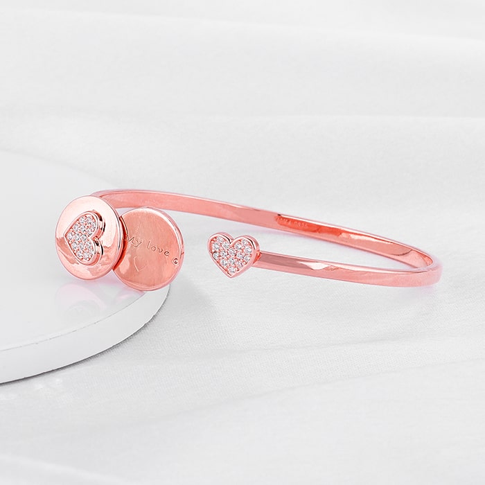 This rose gold open-type bracelet features a heart motif that rotates and studded with zircons on one end and other end has a zircon studded heart in a circle, that has an open heart mechanism where you can custom inscribe the message. Celebrate your moments of passion with GIVA’s Red Romance Collection.