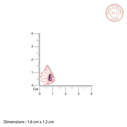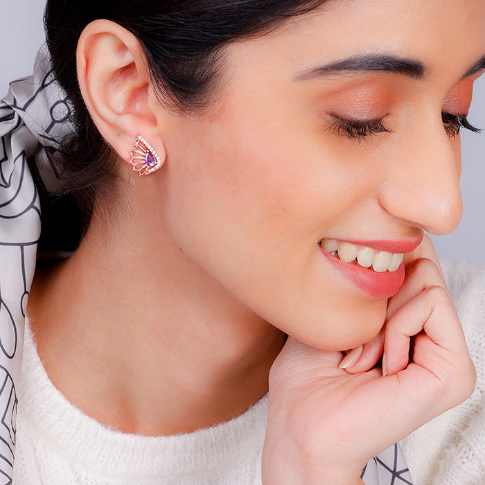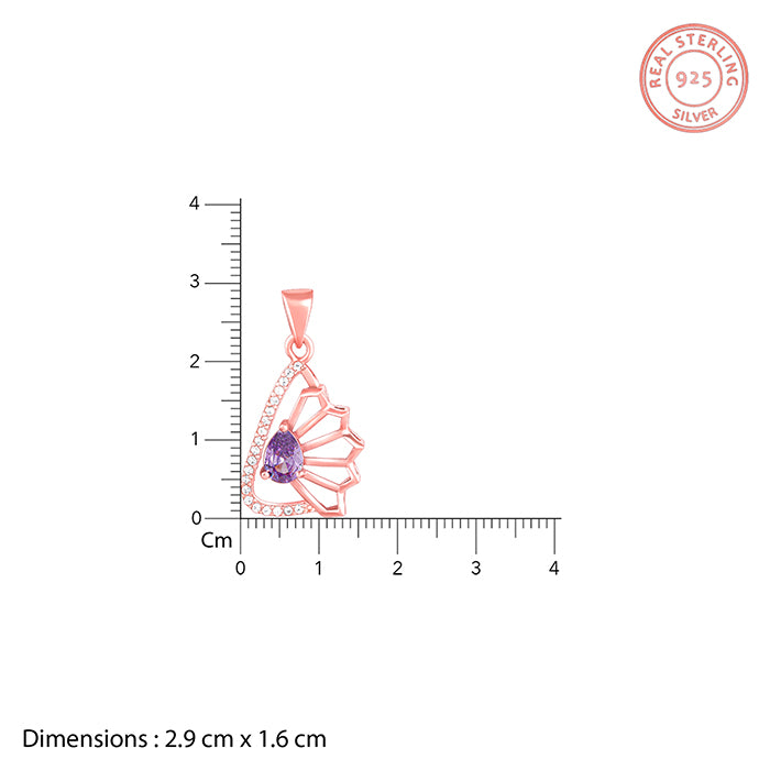 The set features a rose gold pendant and a pair of earrings. It carries a peri-coloured stone placed at the centre. Half of the frame is a flower motif, while white zircons studds the other side of the teardrop frame.