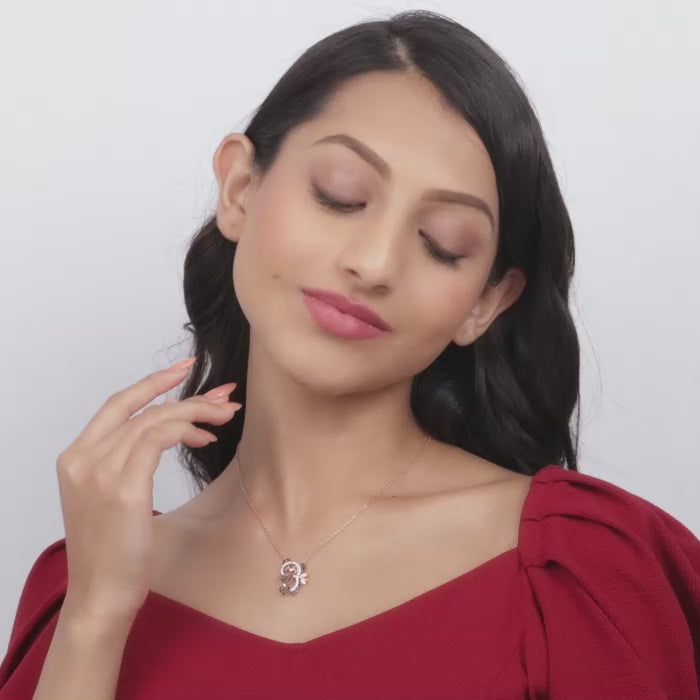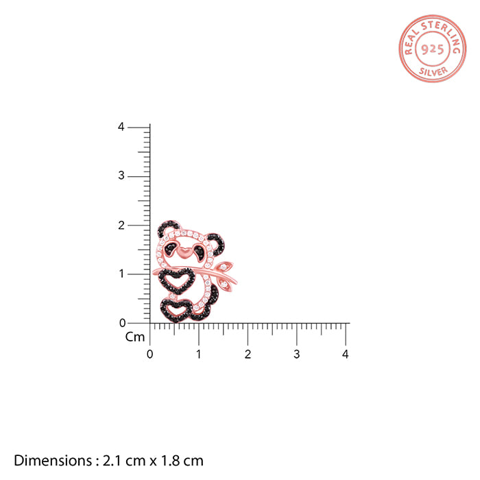 This rose gold pendant features a cute panda carrying two zircon studded hearts.