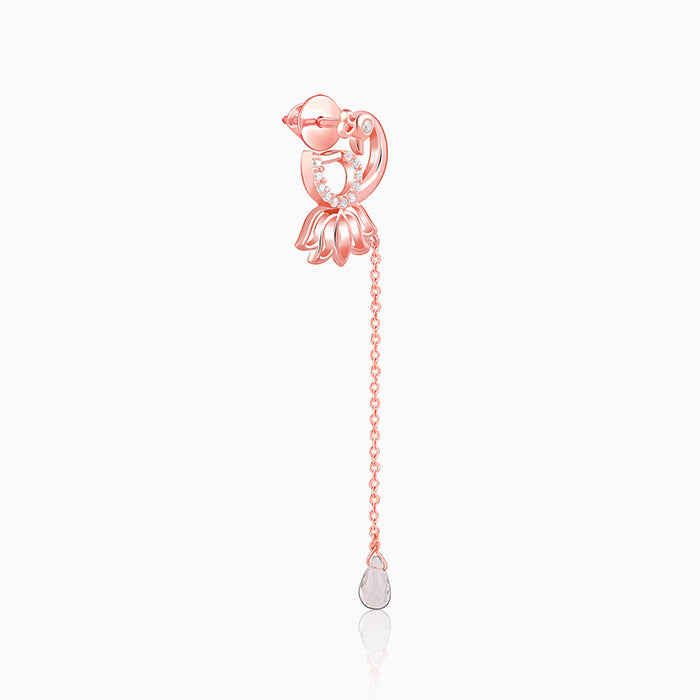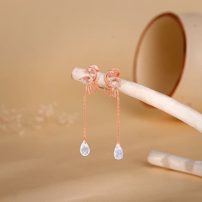 These rose gold drop earrings feature a zircon-studded peacock with a lotus design below and a chain ending in a big zircon. Celebrate the timeless beauty of Indian textiles with GIVA's latest 'Magic of Tradition' collection. Wear and celebrate tradition, anytime.