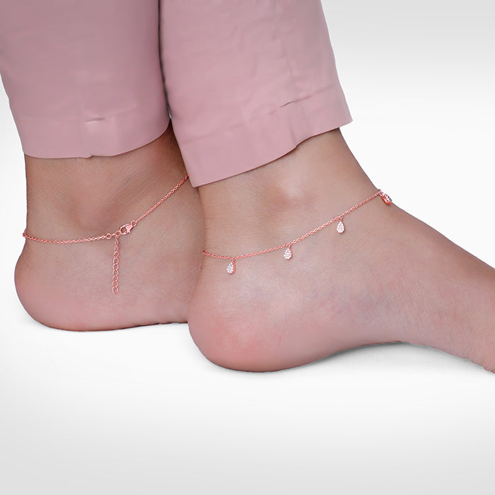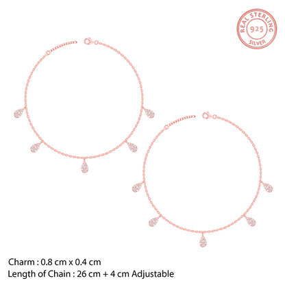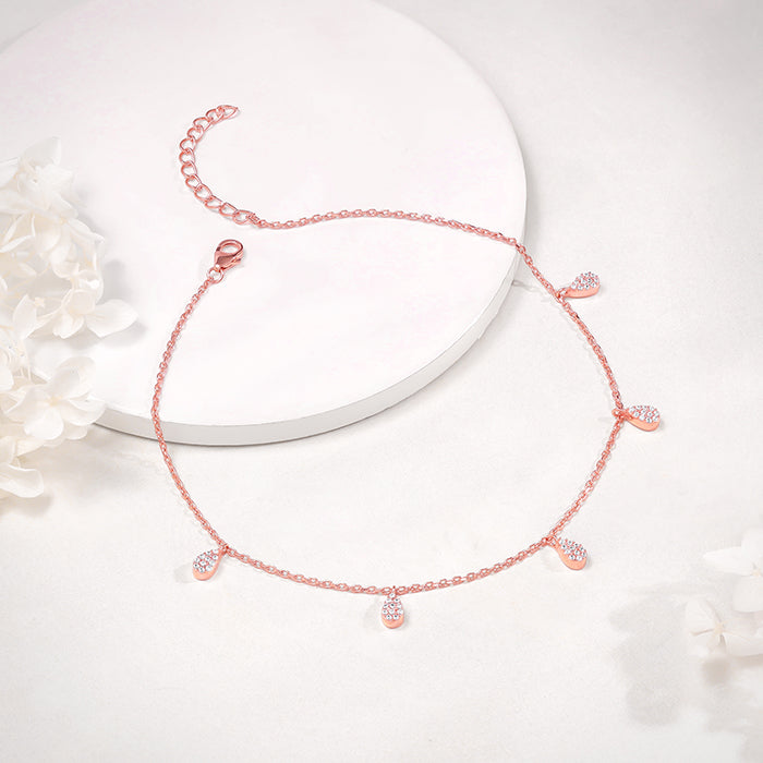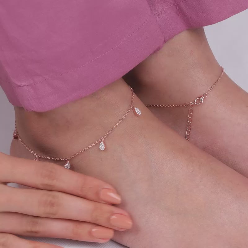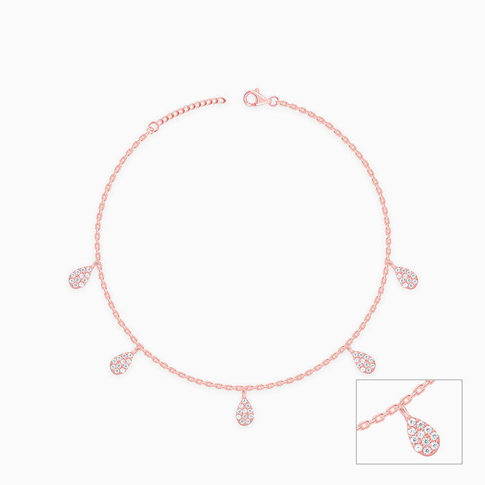 This rose gold plated anklet for women features dangling peardrop motifs set with zircon along the band.