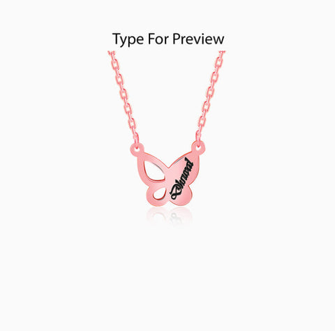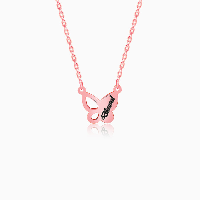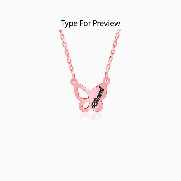 This rose gold plated customized name necklace for women features a butterfly pendant with a cutout design, allowing you to personalise one side with the name of your choice.