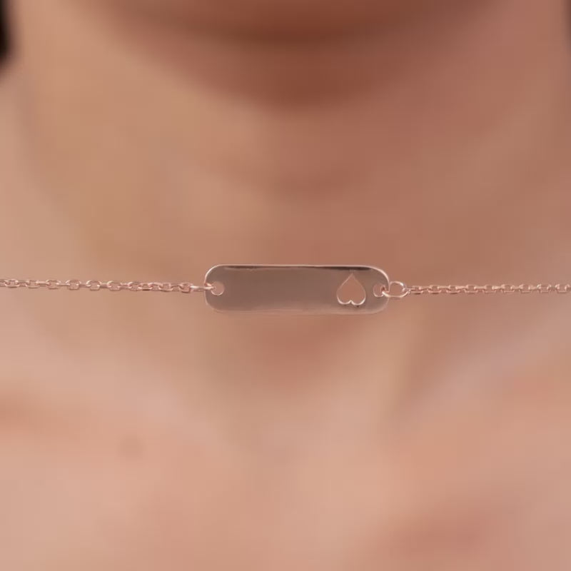 A dainty rose gold plated bracelet featuring a custom-engraved nameplate with a subtle heart cut-out. Lightweight yet durable, the gorgeous link chain connects to a secure clasp with adjustable links for a perfect fit. Whether it’s your name, a loved one’s, or a meaningful word—it’s yours to make personal.