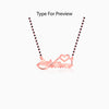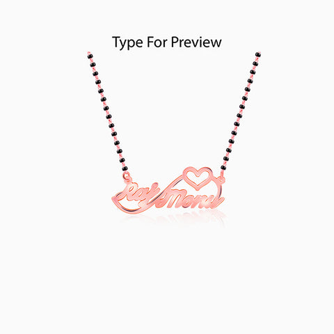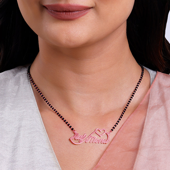 This personalised rose gold plated mangalsutra for women features two names of your choice. The names are linked by a wave-like motif with a cute heart. Black beads form the chains of the mangalsutra.