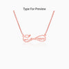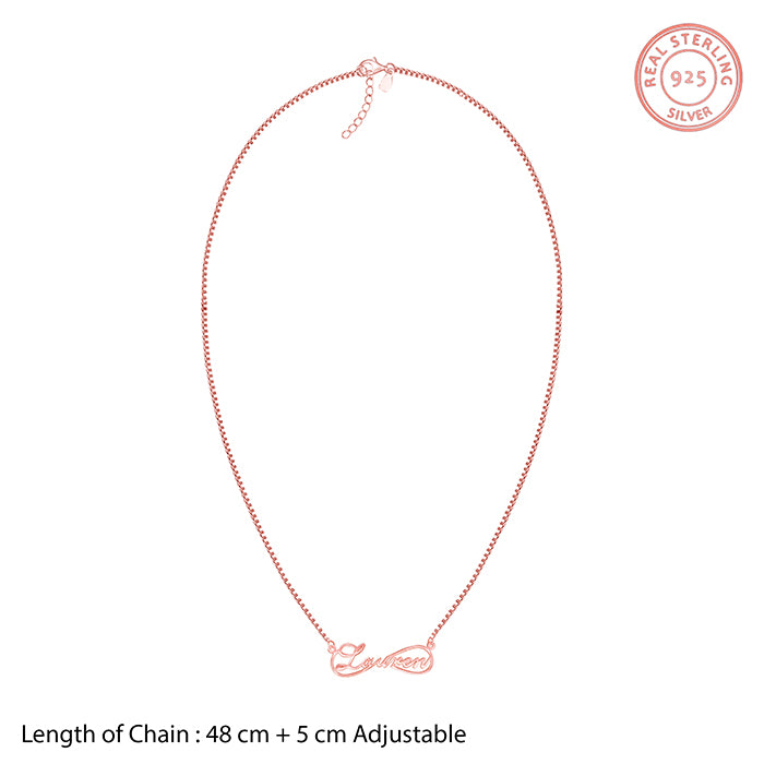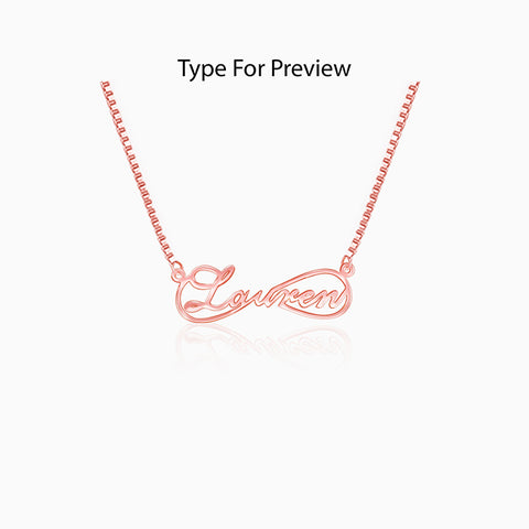 This rose gold pendant features a name enclosed within a half-infinity motif.