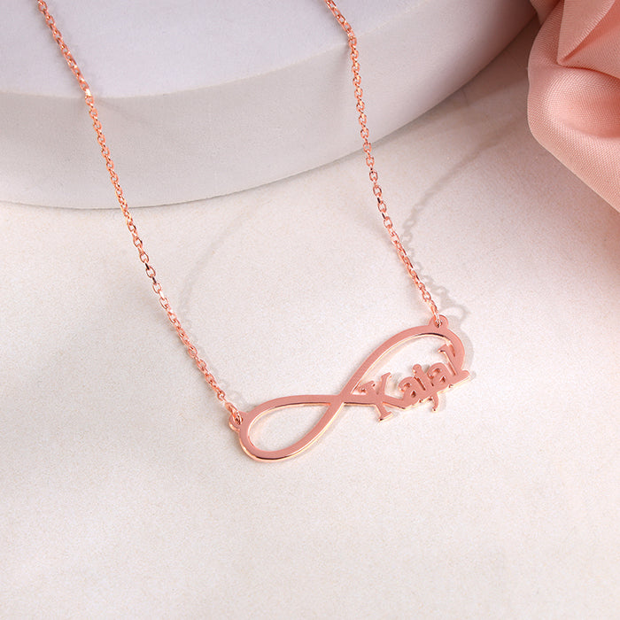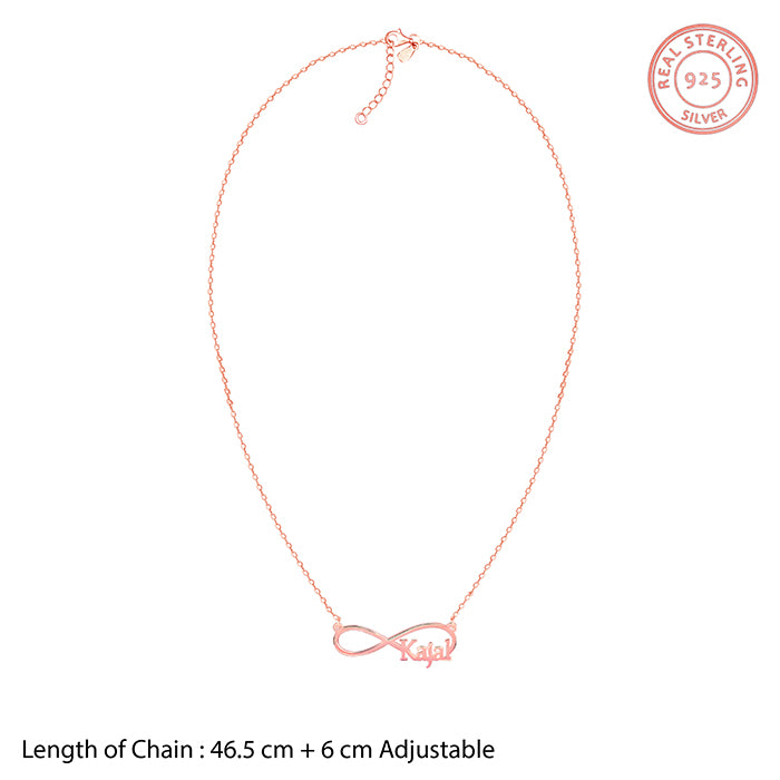 This personalised rose gold plated necklace for women features an infinity motif with a name of your choice sitting elegantly on one of the loops.