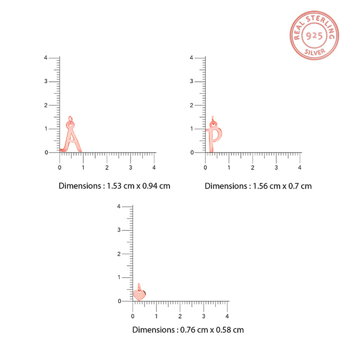 This personalised rose gold plated initial necklace features the initials "A" and "P," with a heart charm dangling from the centre of the chain.