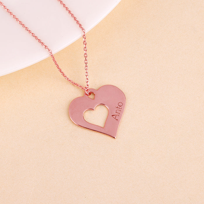 This personalised rose gold pendant for women features a stunning duo of meticulously crafted heart pendants. The larger heart boasts an elegant cut-out design, perfectly complemented by a smaller, solid heart pendant. Both are designed to be worn together, or separately, creating a versatile and deeply meaningful jewellery experience.