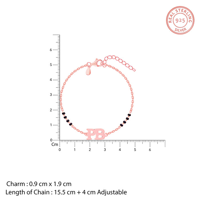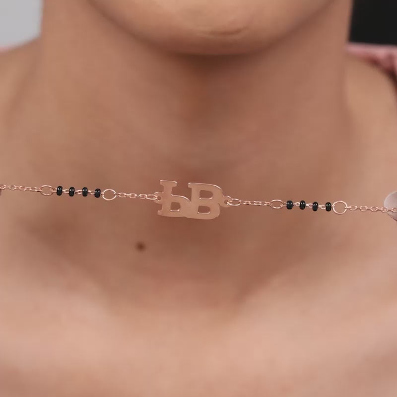 This rose gold plated mangalsutra personalised bracelet for women features a sleek silver chain adorned with segments of black beads. At the centre lies a bold customisable initial charm, allowing you to personalise it with any letters of your choice.
