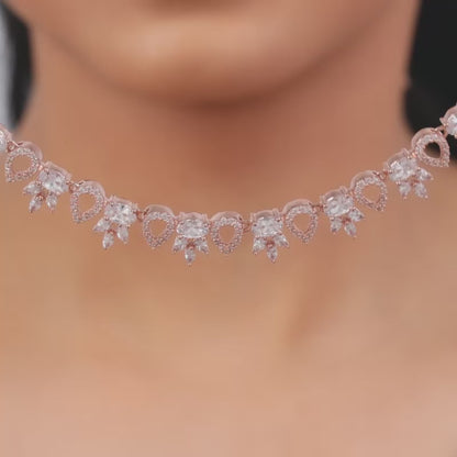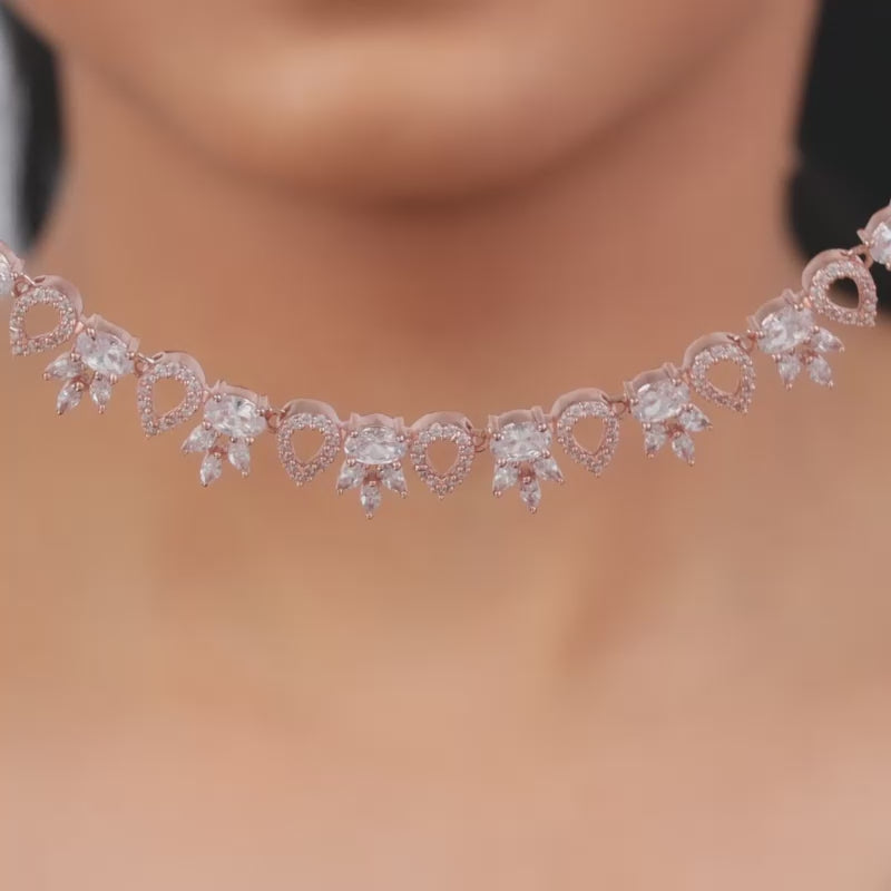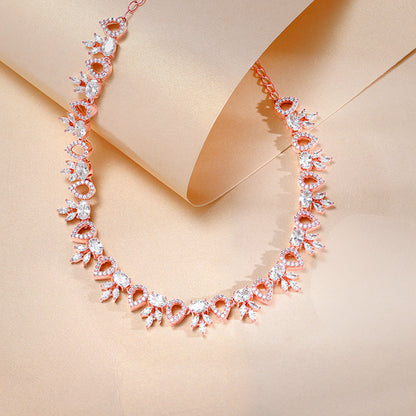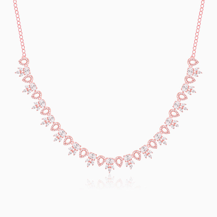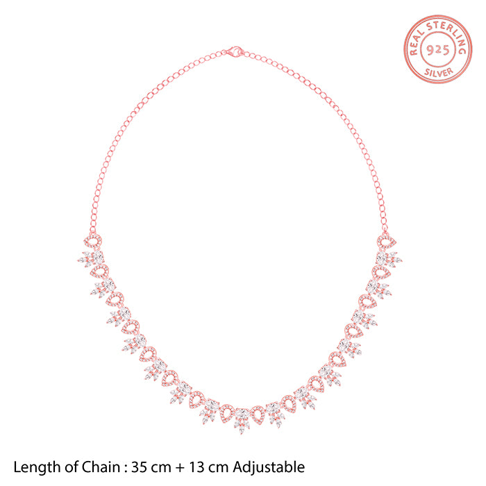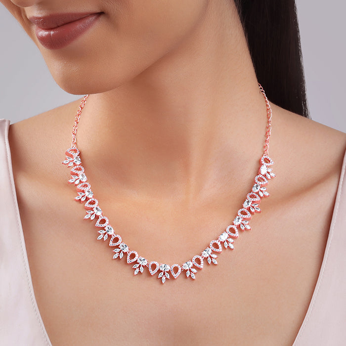 This silver necklace for women features an elegant combination of teardrop motifs and semi-floral motifs, placed alternately. The motifs are elegantly studded with zircons of varying sizes.
