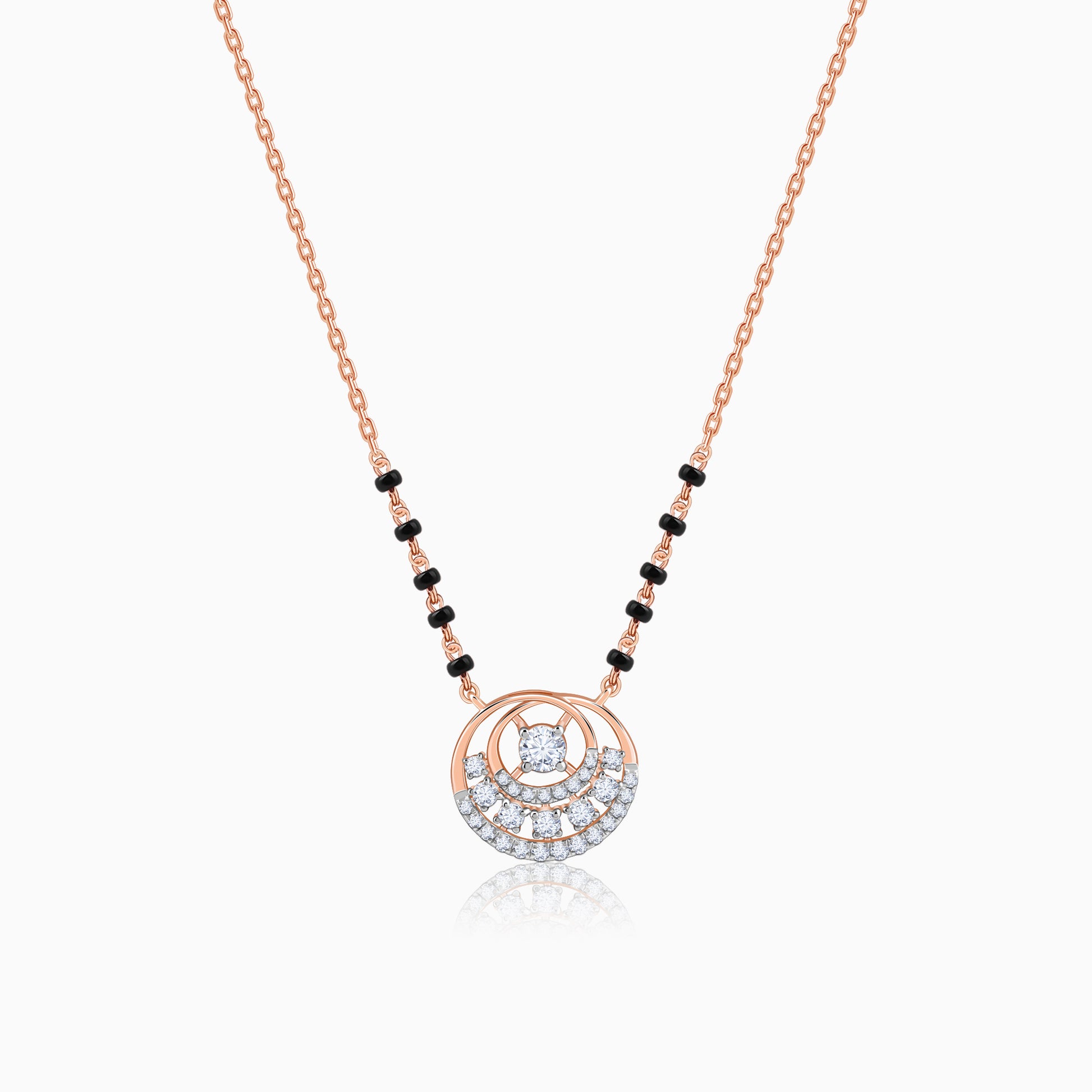 This pure rose gold mangalsutra for women features black beads along the chain and a circular design. It's studded with layers of lab grown diamonds in a concentric pattern.