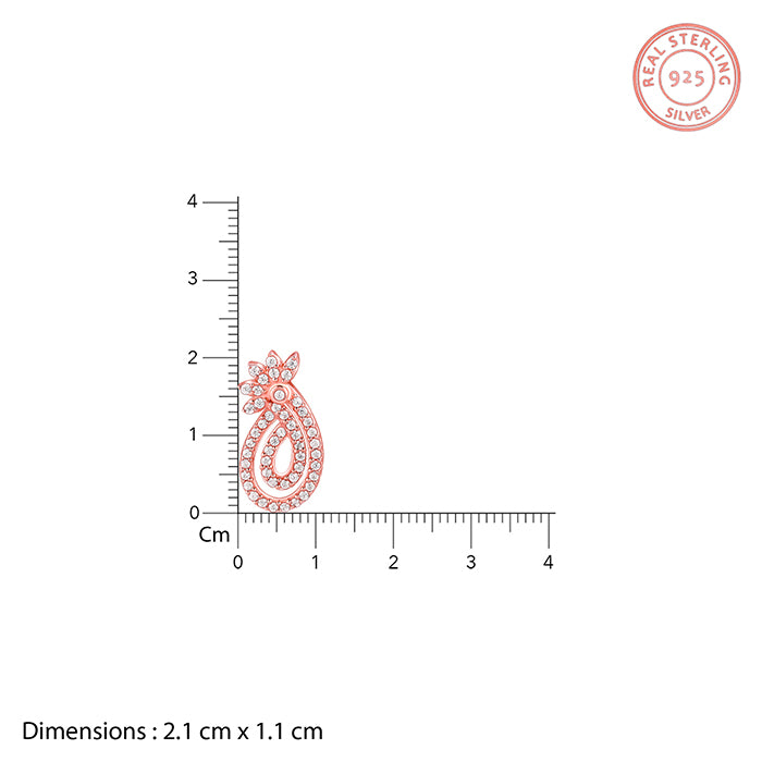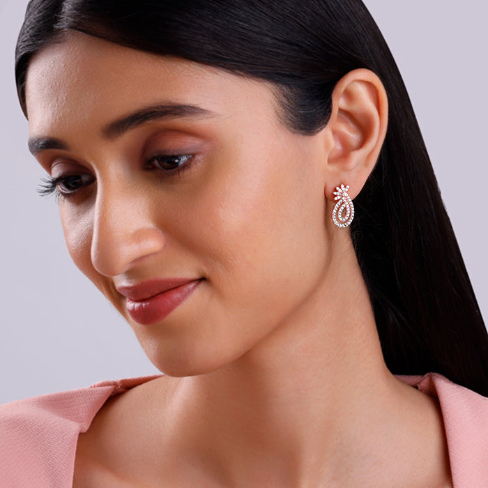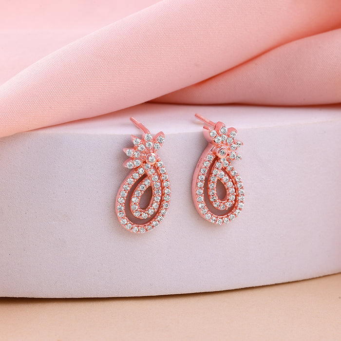 These rose gold plated earrings showcase a floral design at the top. A sparkling double teardrop design, encrusted with zircons, adds elegance and brilliance to the piece.