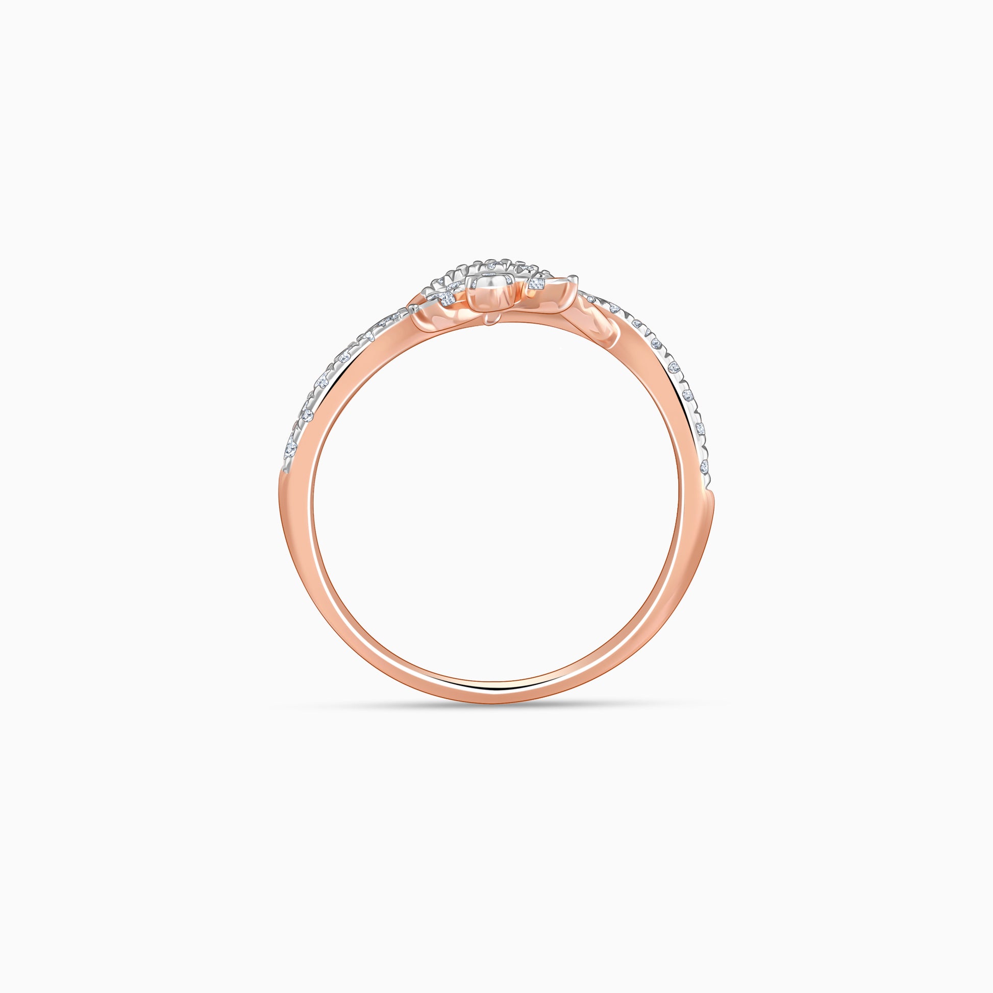This pure rose gold ring for women features a leafy motif with a twisted design beneath. The entire design is studded with sparkling lab grown diamonds. Additional lab grown diamonds are studded in the band.