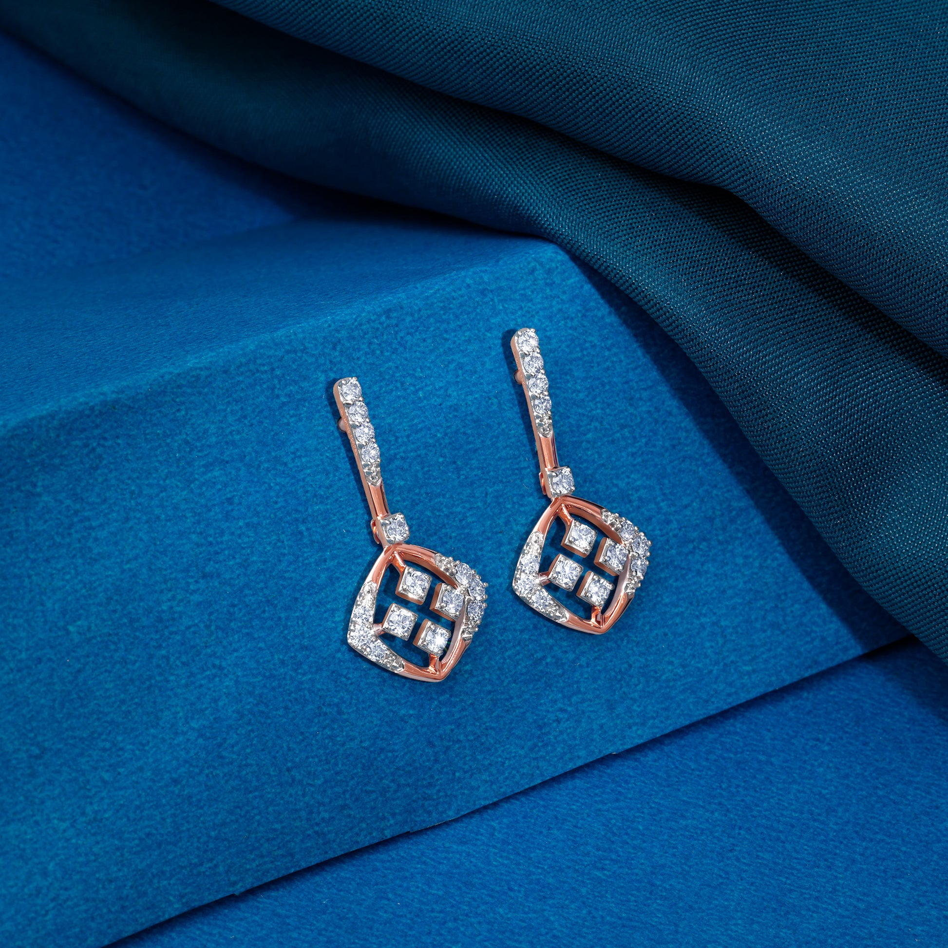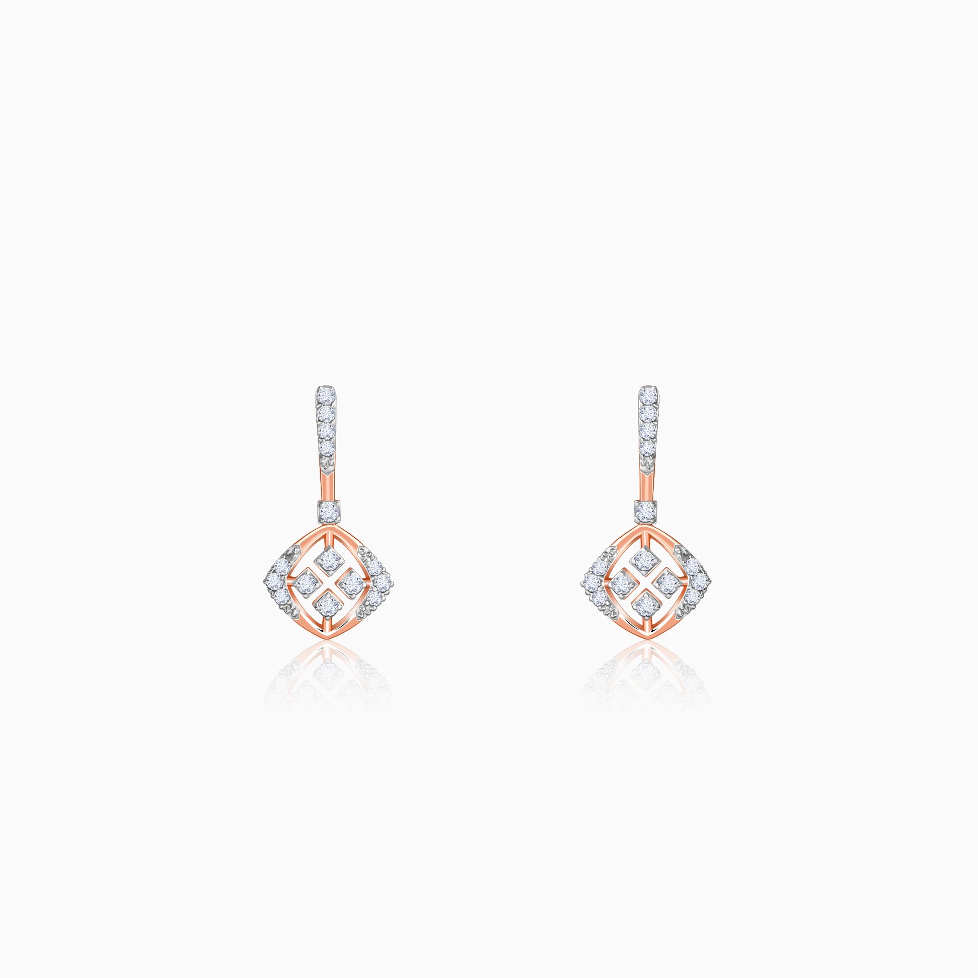 These pure rose gold earrings for women feature a sleek vertical bar, partially studded with lab grown diamonds, as the upper dangle. The lower dangle features a softer rhombus motif, accentuated with lab grown diamonds at the corners and within.