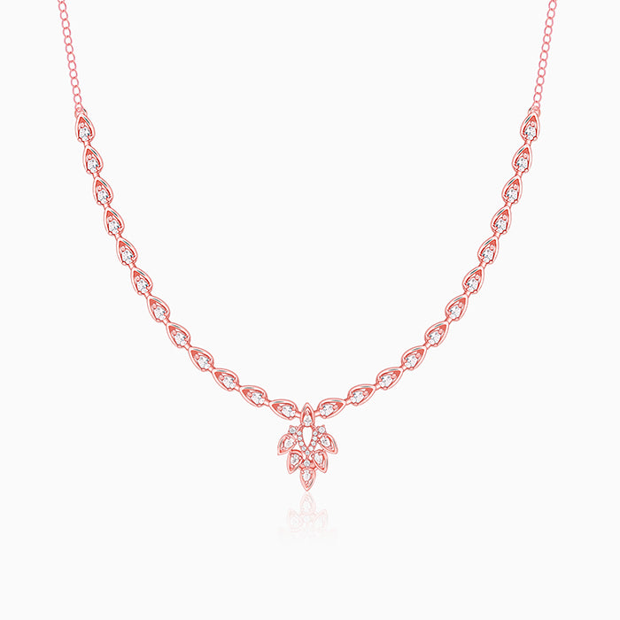This rose gold necklace for women is composed of a continuous chain of individual, zircon-accented marquise-shaped links that resemble leaves. The design culminates in a striking central pendant where these leaf motifs are artistically clustered to form a cascading, nature-inspired floral spray. Presenting our DIVA Collection - a limited edition silver jewellery meant for the women who own every room. Be the star of the party, always.