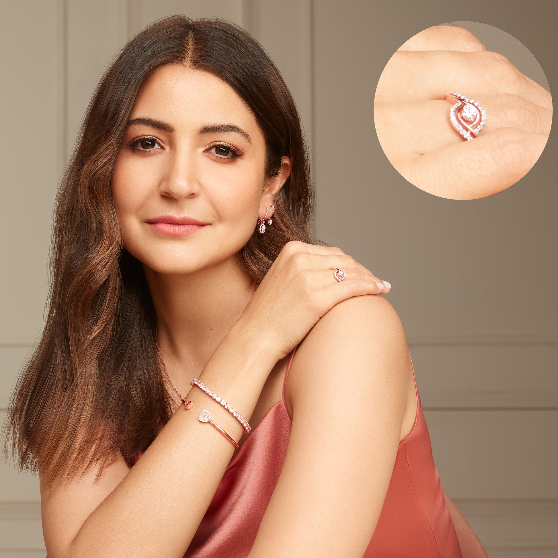 This pure rose gold ring for women features a bypass band with a round-cut solitaire lab grown diamond at the centre. The band is partially lined with smaller lab diamonds in a pave setting.