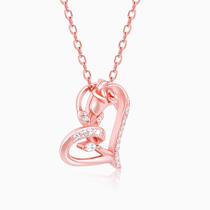 The rose gold pendant features a heart shape studded with zircons and intertwined with a rose.