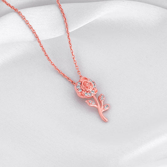 This rose gold pendant has a rose motif with three leaves studded with zircons.