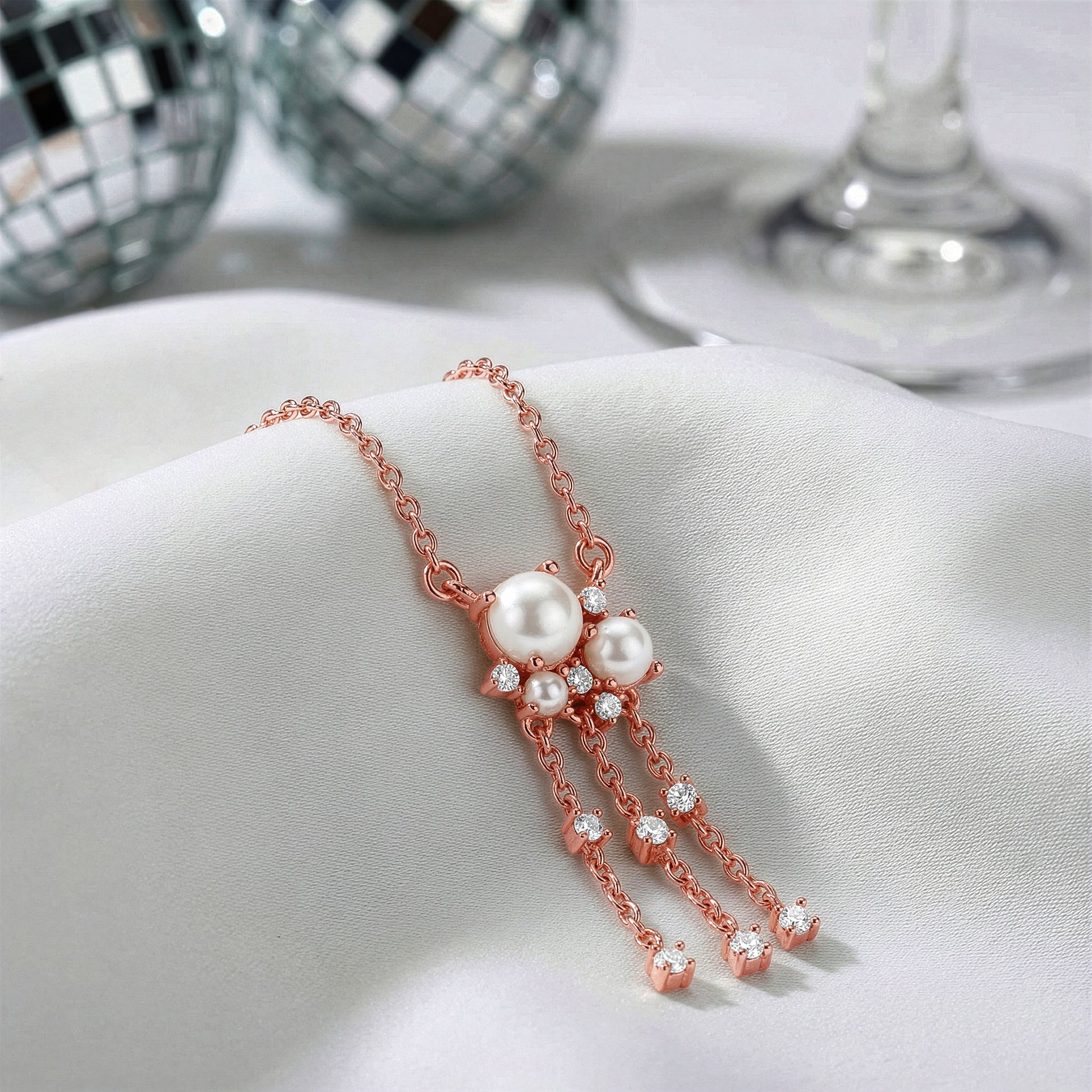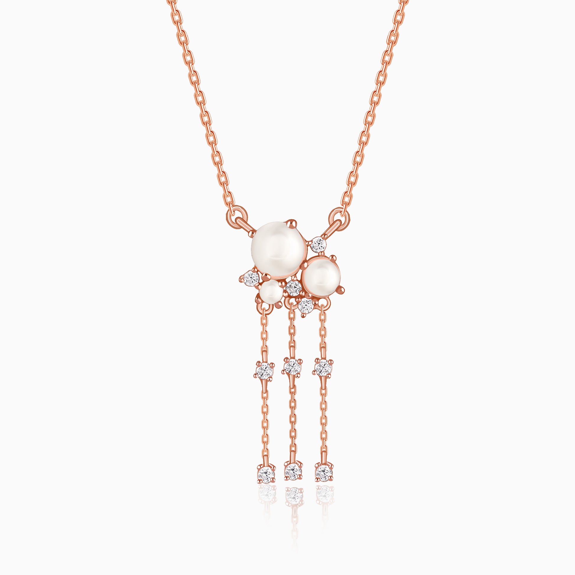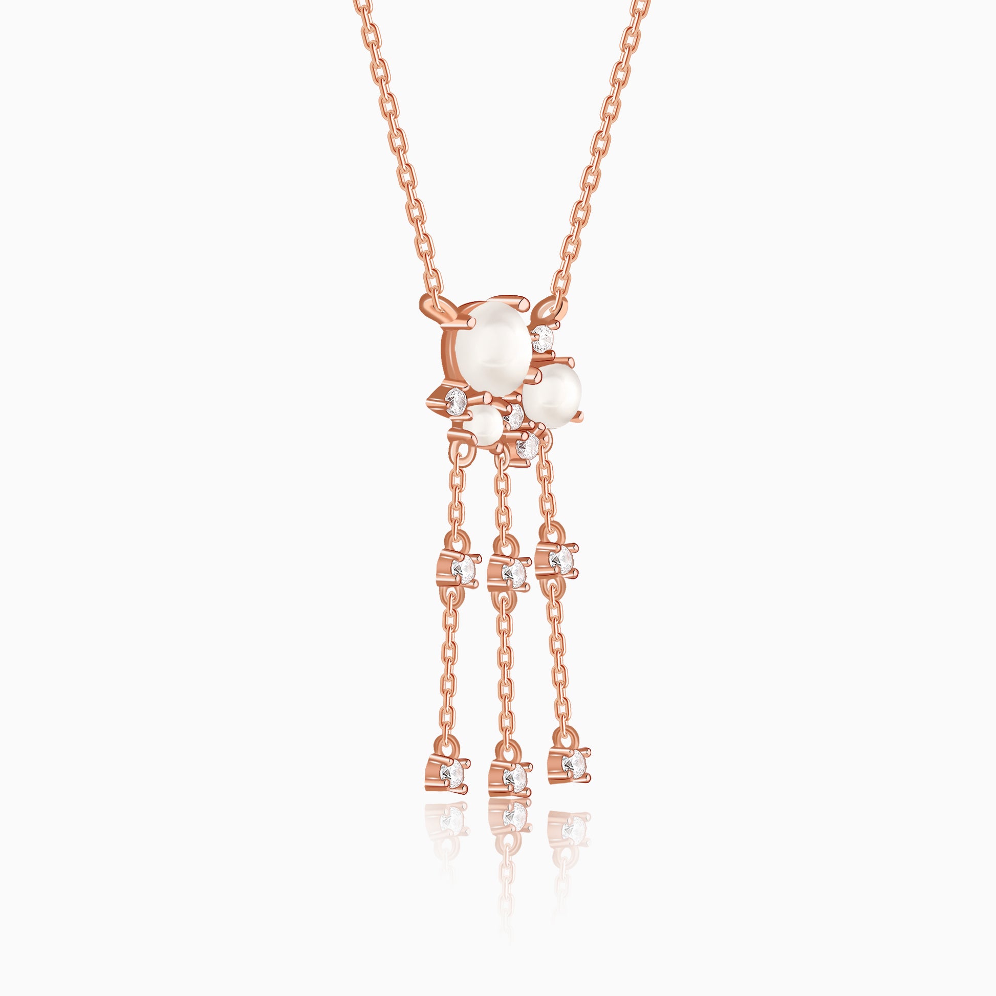 Three pearls sit at the heart of the necklace, separated by glimmering zircons that add sparkle in between. An elegant design in rose gold that feels both classic and modern, full of feminine charm. Barkha Singh x GIVA brings to you the Glow in Motion collection that celebrates CNC craftsmanship for the first time in silver.