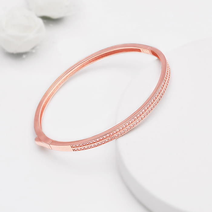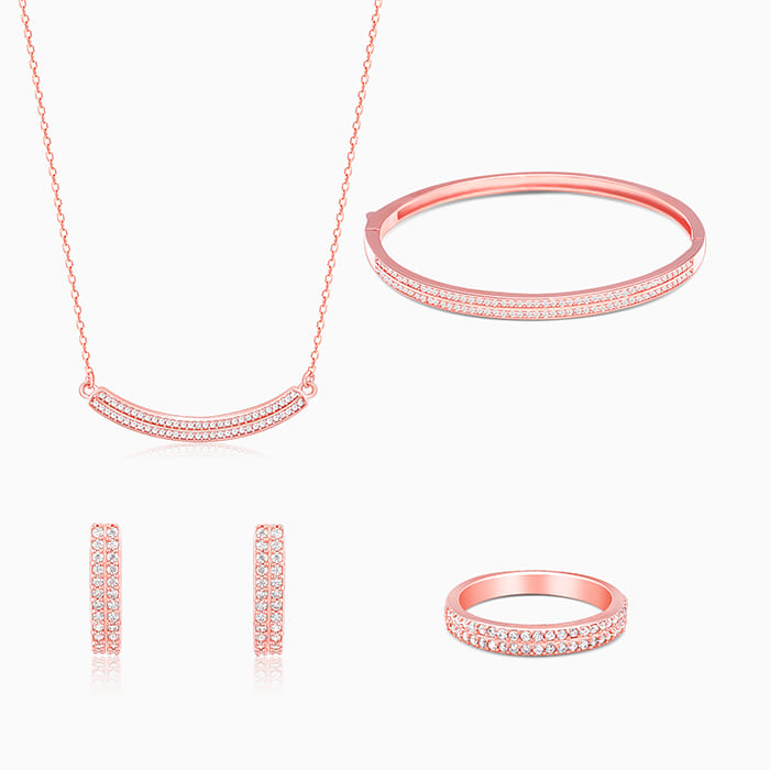 This rose gold set of four contains a pendant with a link chain, a pair of earrings, a bracelet, and a ring, featuring a dual-layer with zircons.