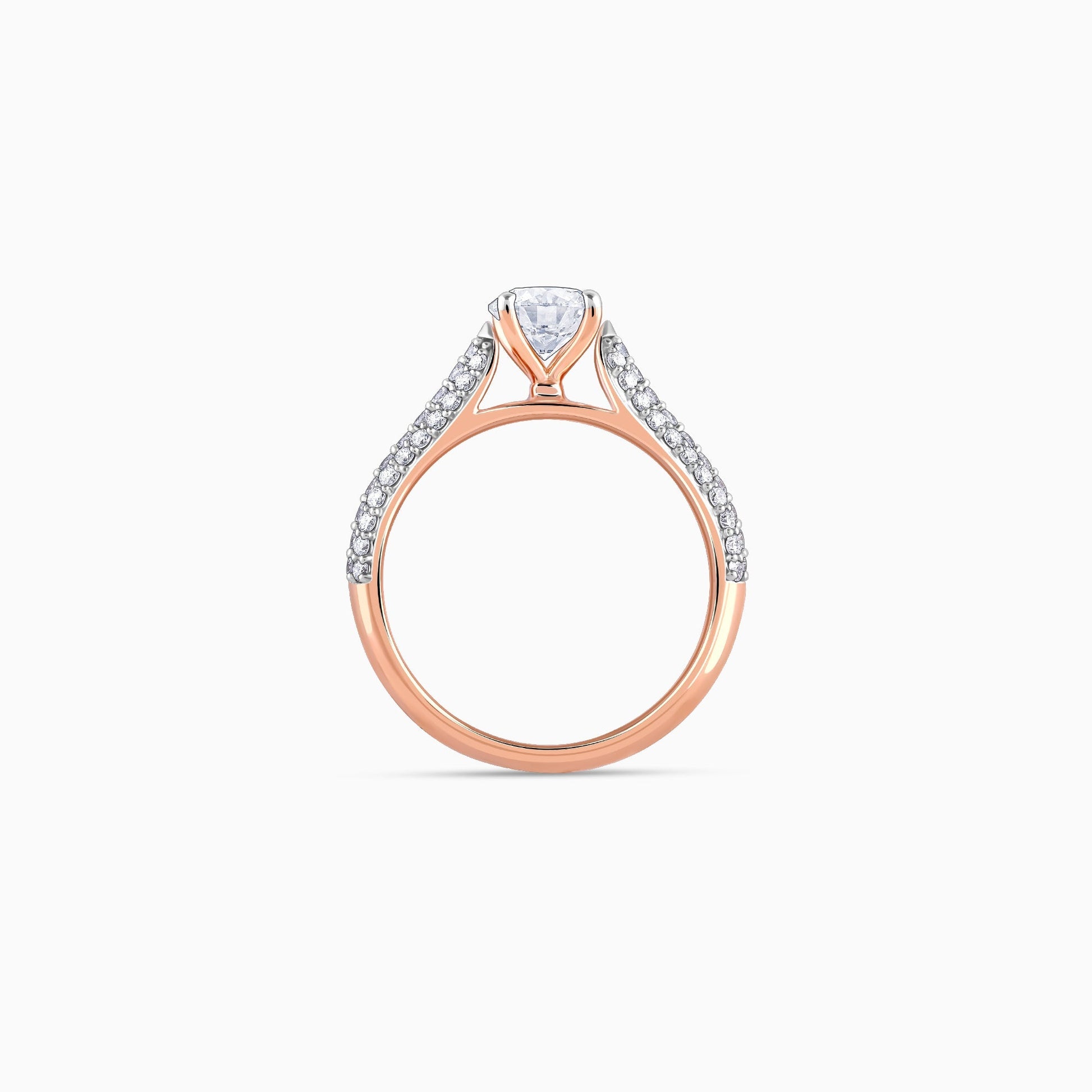 This pure rose gold ring for women features a large lab diamond at the centre, complemented by smaller lab diamonds on the band.