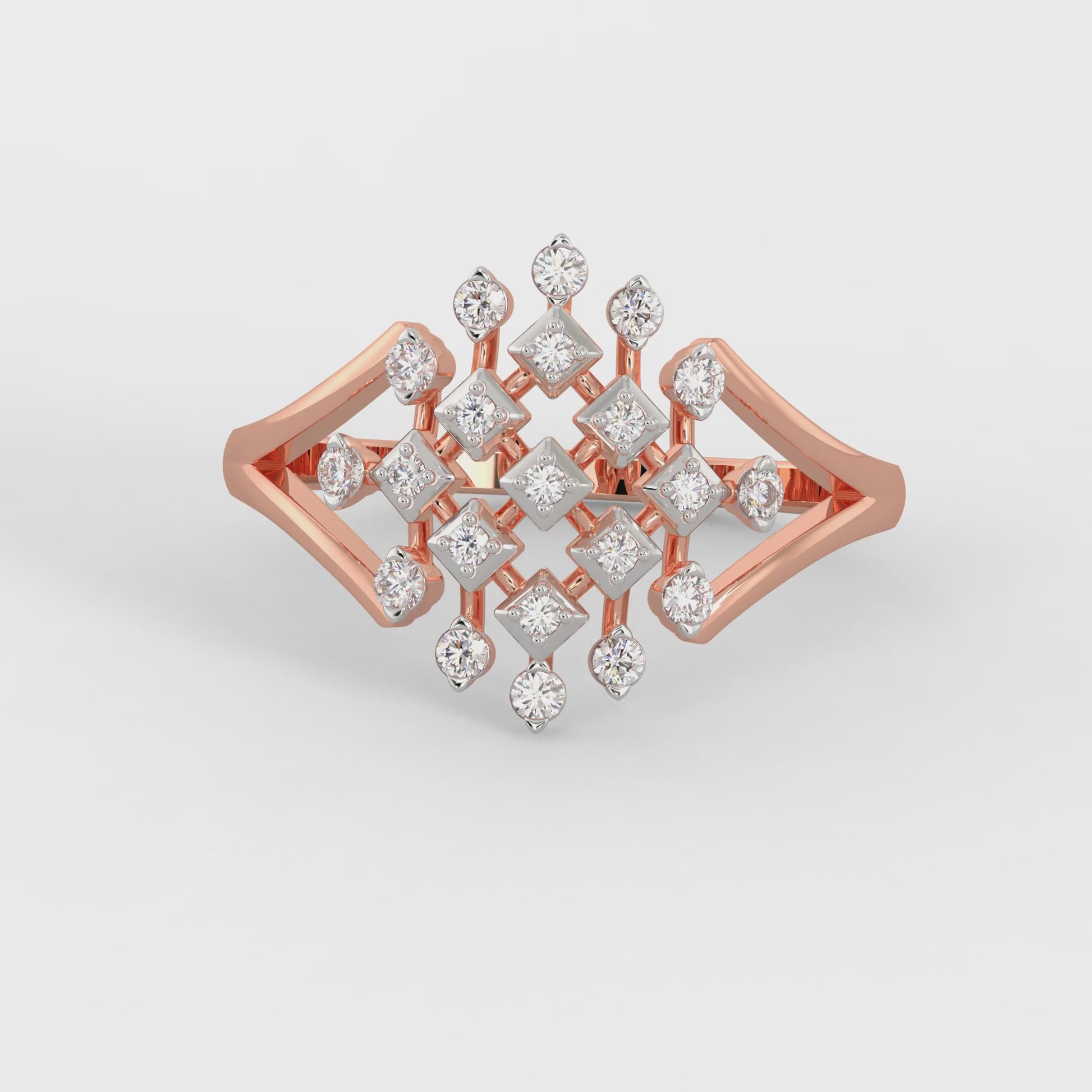 This pure rose gold ring features a classic motif with an intricate design studded with lab-grown diamonds.