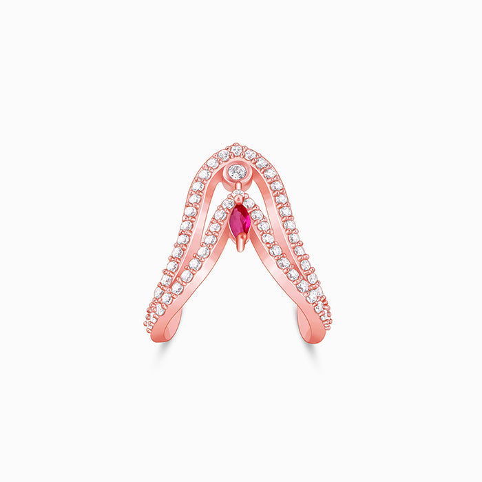 This rose gold Vanki ring features a dual-layer "V" design, pave-set with zircons. Two different cuts - round zircon and pink marquise-cut stones, elegantly dangle from the top. Presenting our DIVA Collection - a limited edition silver jewellery meant for the women who own every room. Be the star of the party, always.