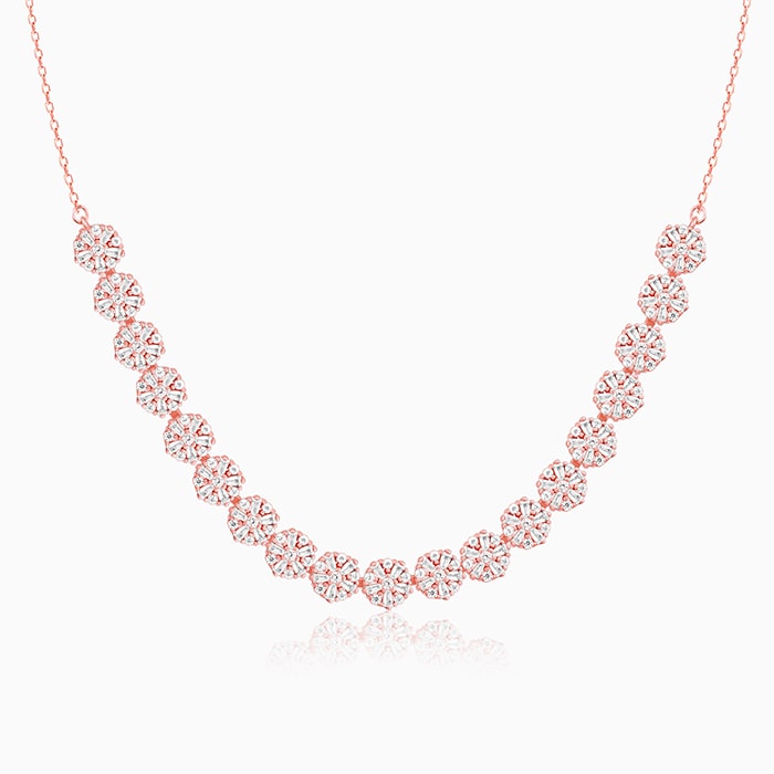 This rose gold necklace has a set flower motifs studded with zircons.
