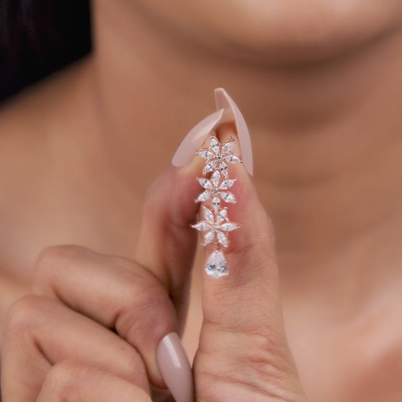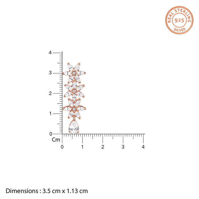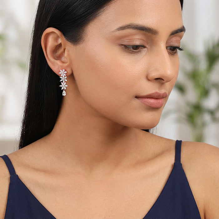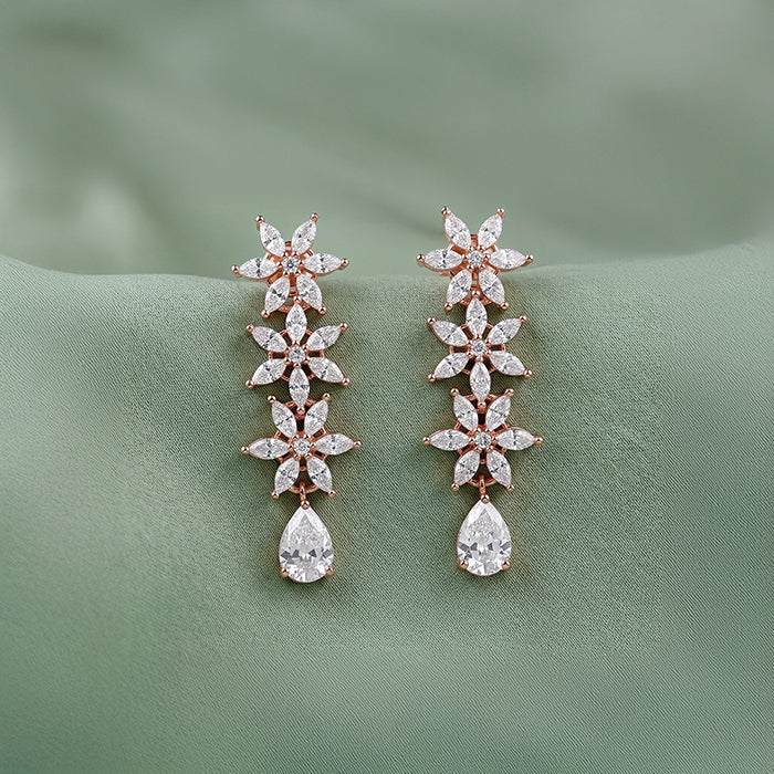 She chooses jewellery that speaks of elegance and confidence. These rose gold plated silver earrings feature a floral motif studded with zircons, highlighted by a pear-shaped zircon at the centre for a radiant, regal look.