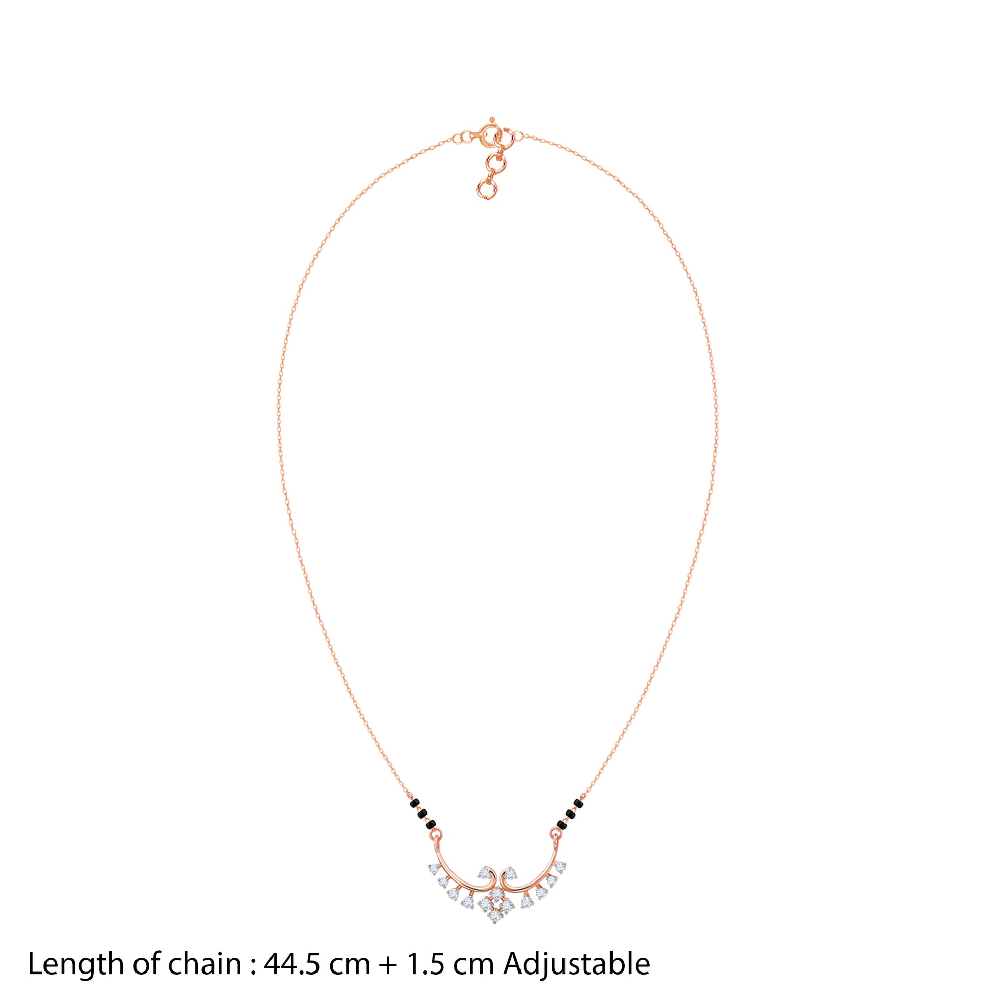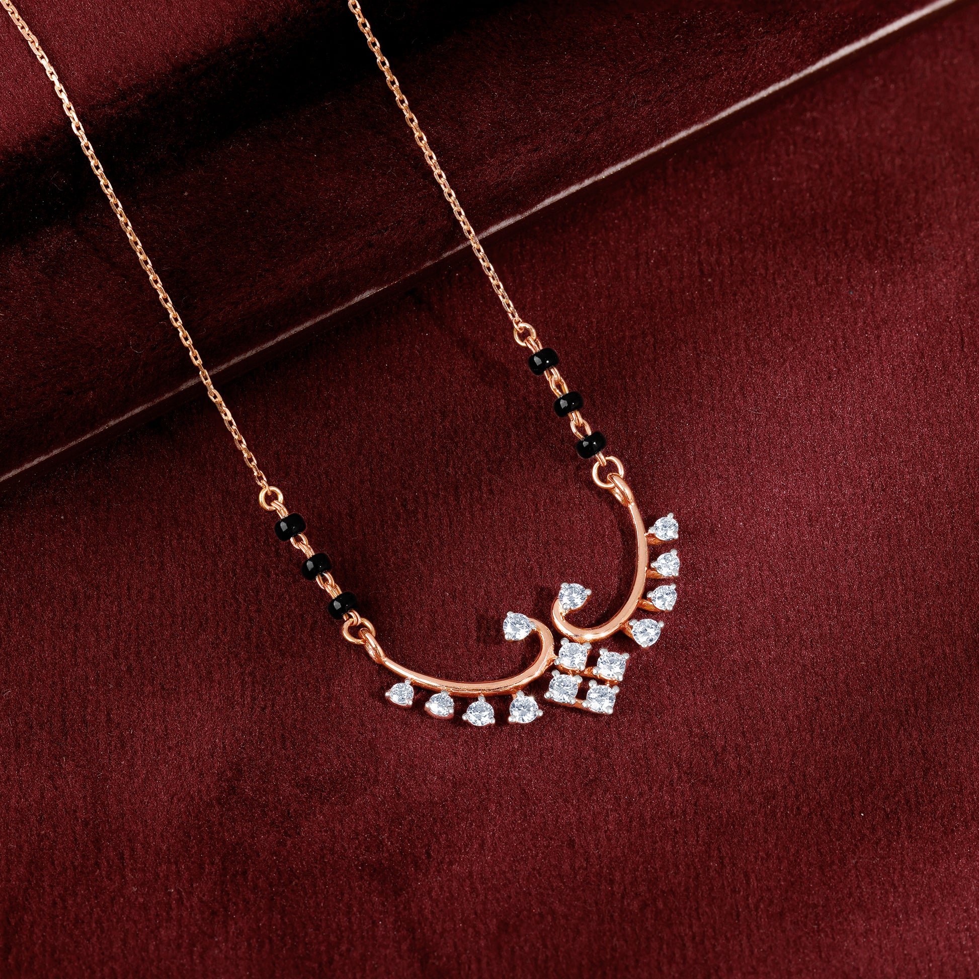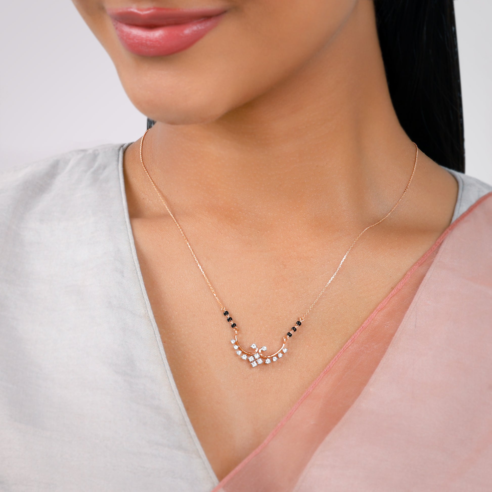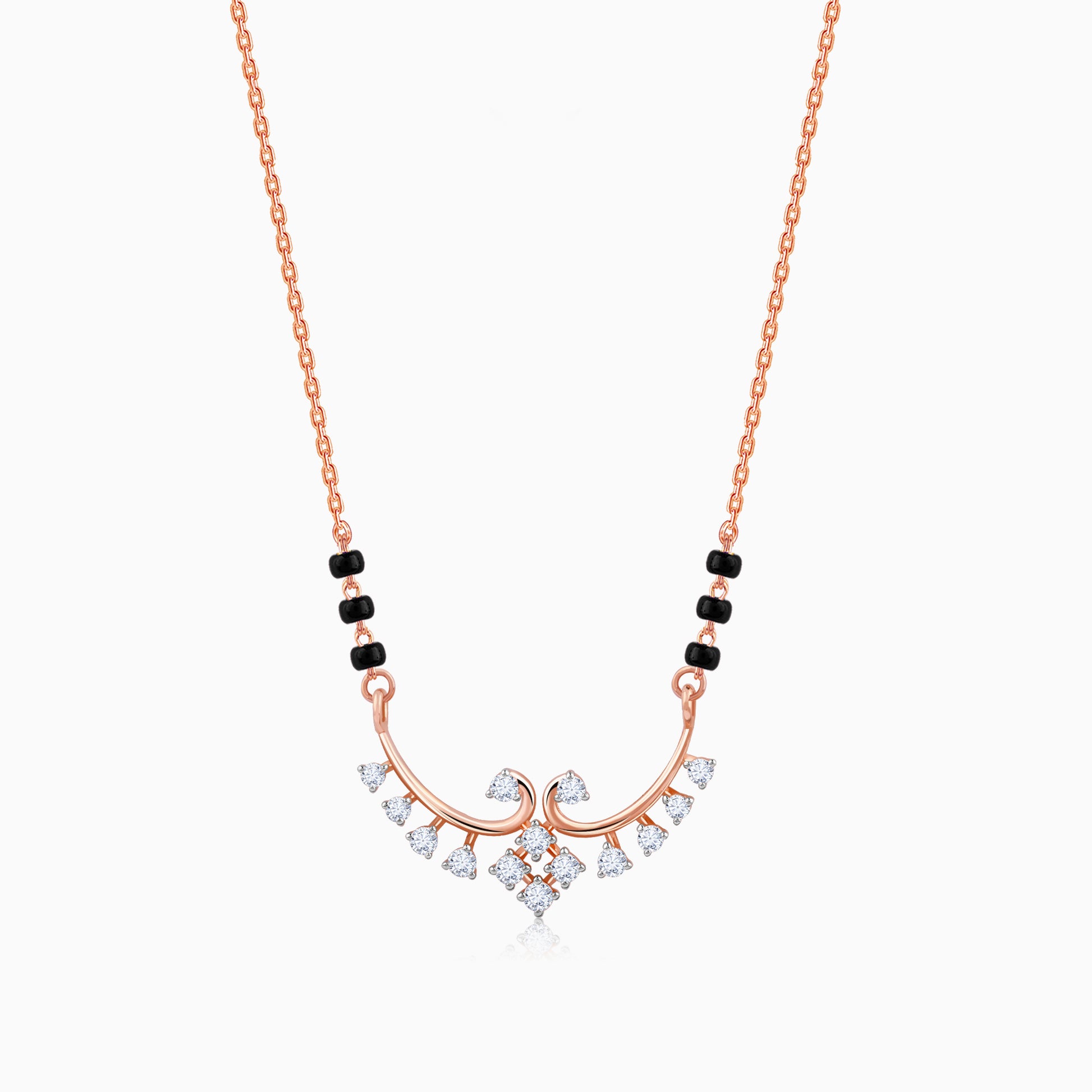 This pure rose gold mangalsutra for women features a stylised crescent-shaped frame that meets at the centre. The design is beautifully studded with lab grown diamonds and has three black beads on the chain on both sides.