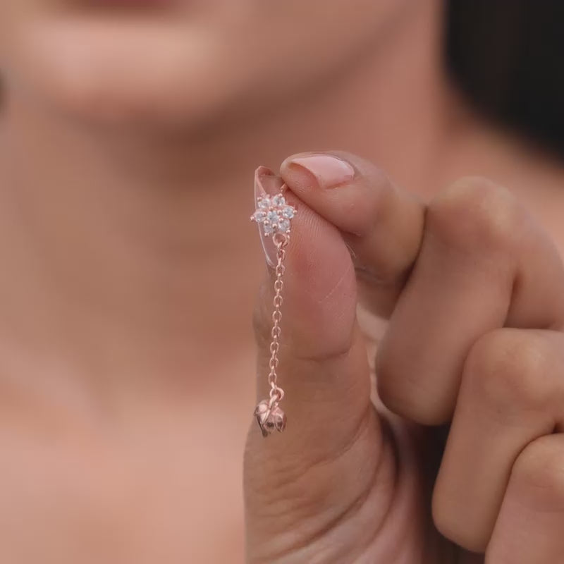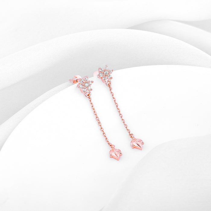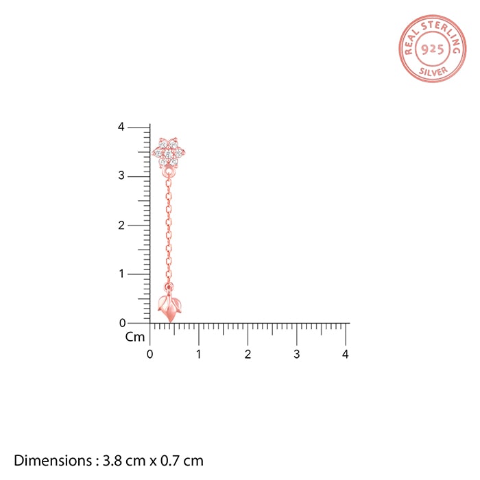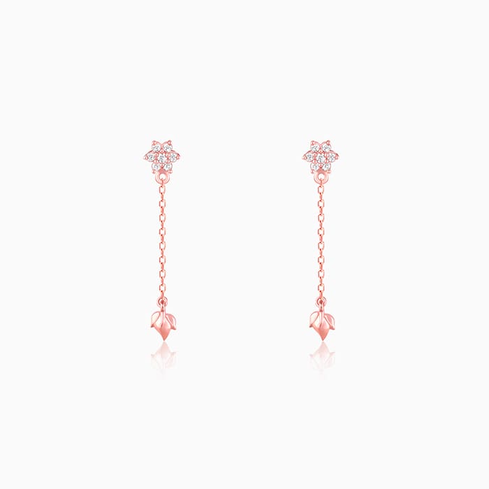 These rose gold earrings have a zircon studded floral motif with a dangler.