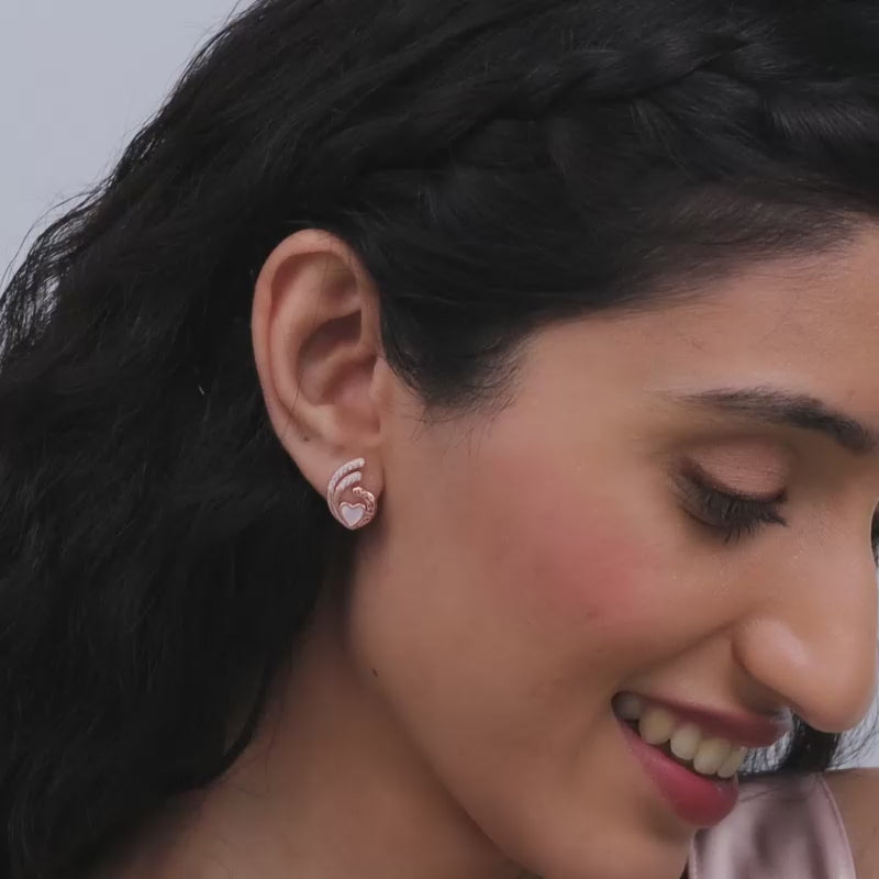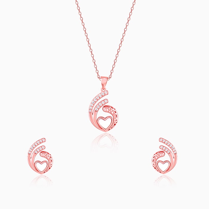 This rose gold set has an intricate design with a mother-of-pearl set inside in a heart motif, and zircons studded on the surface.