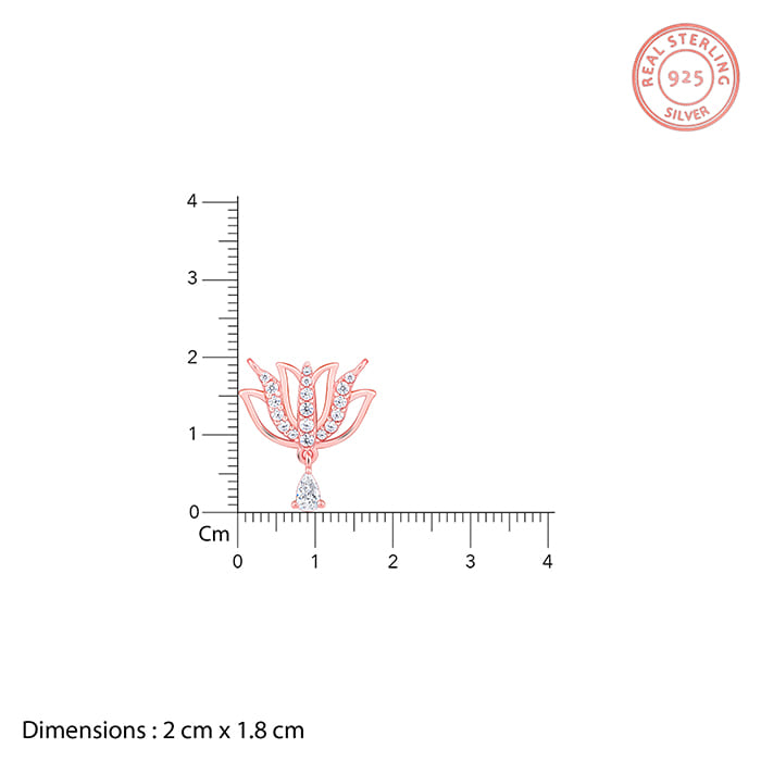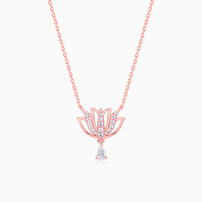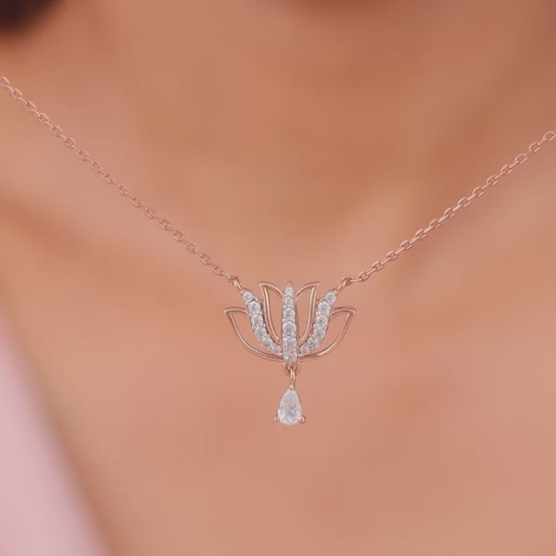 This rose gold necklace features a lotus motif, with shimmering zircons and a graceful drop zircon. Celebrate the timeless beauty of Indian textiles with GIVA's latest 'Magic of Tradition' collection. Wear and celebrate tradition, anytime.