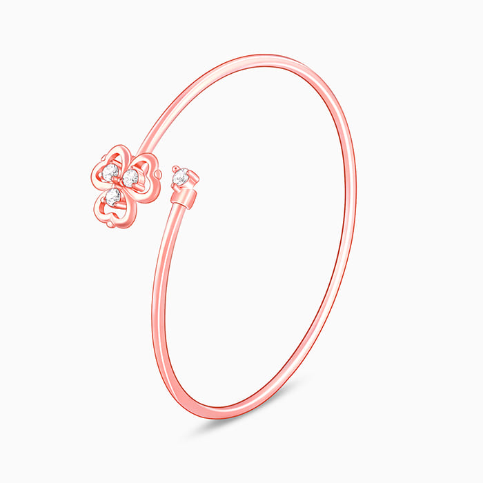 This rose gold set of four contains a pendant with a link chain, a pair of earrings, a ring, and a bracelet, featuring a three-clover leaf design with each leaf nestling a zircon.
