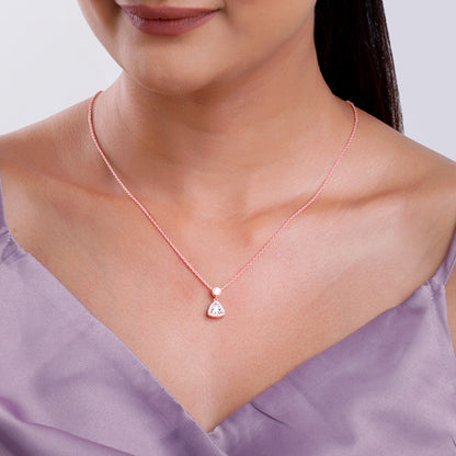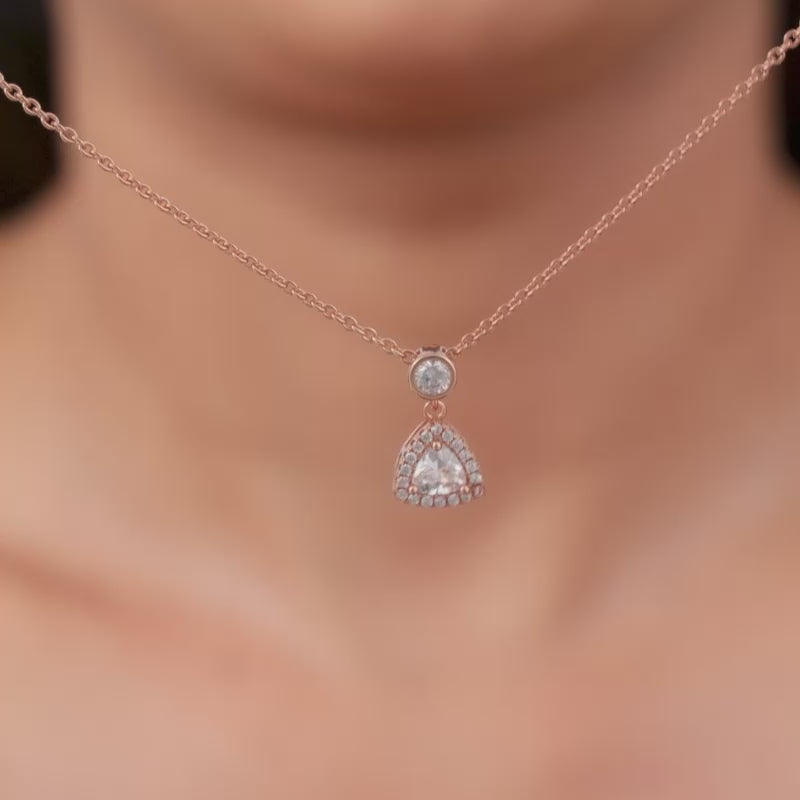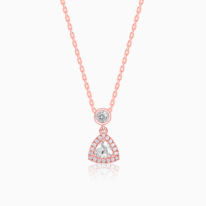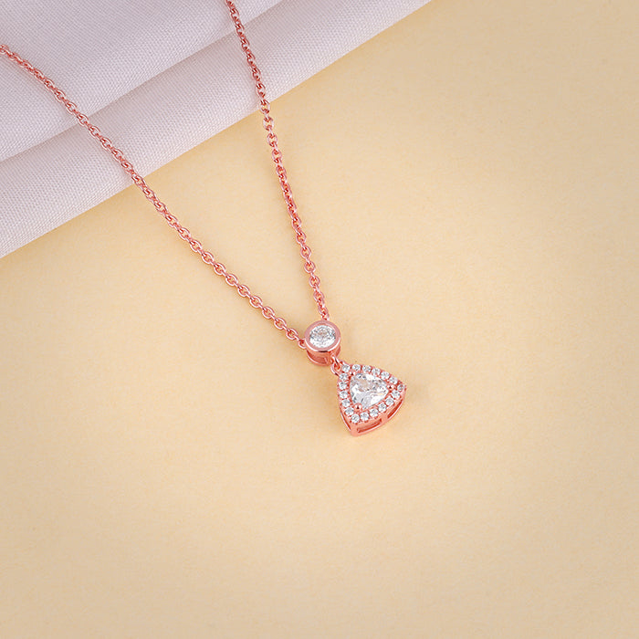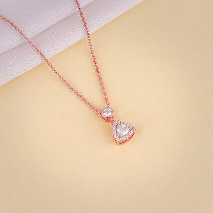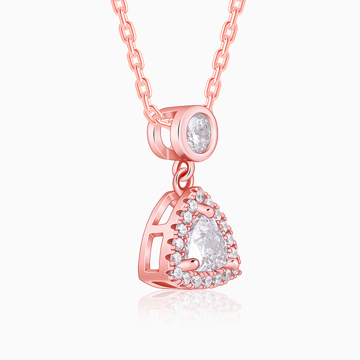 This rose gold necklace for women features a triangular motif as its focal point, set with a large zircon and encircled by a halo of smaller zircons. A round, bezel-set zircon seamlessly connects the triangular pendant to the chain above.