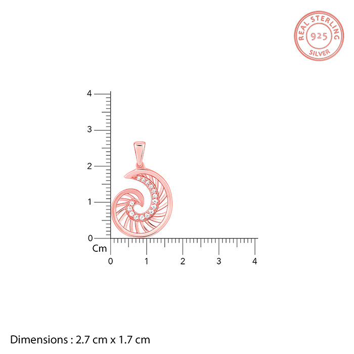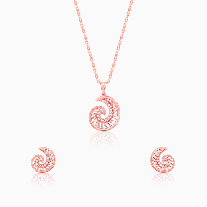 This rose gold set has a pendant and a pair of earrings, each featuring a volute shape with line designs adorned with zircons in the inner curve.
