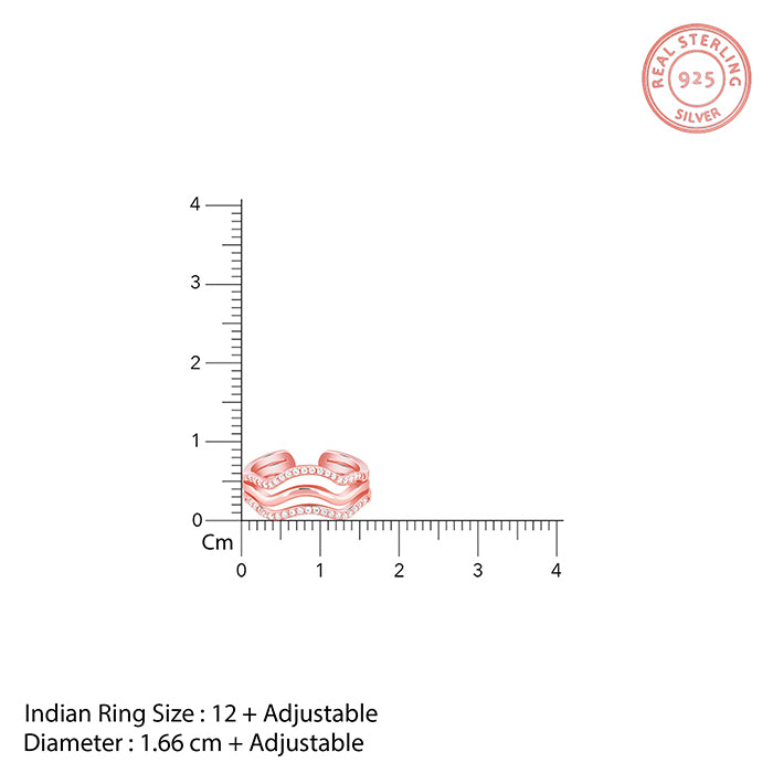 This rose gold ring for women features a three-tiered wave design, with the middle tier plain and the other two tiers set with sparkling zircons.
