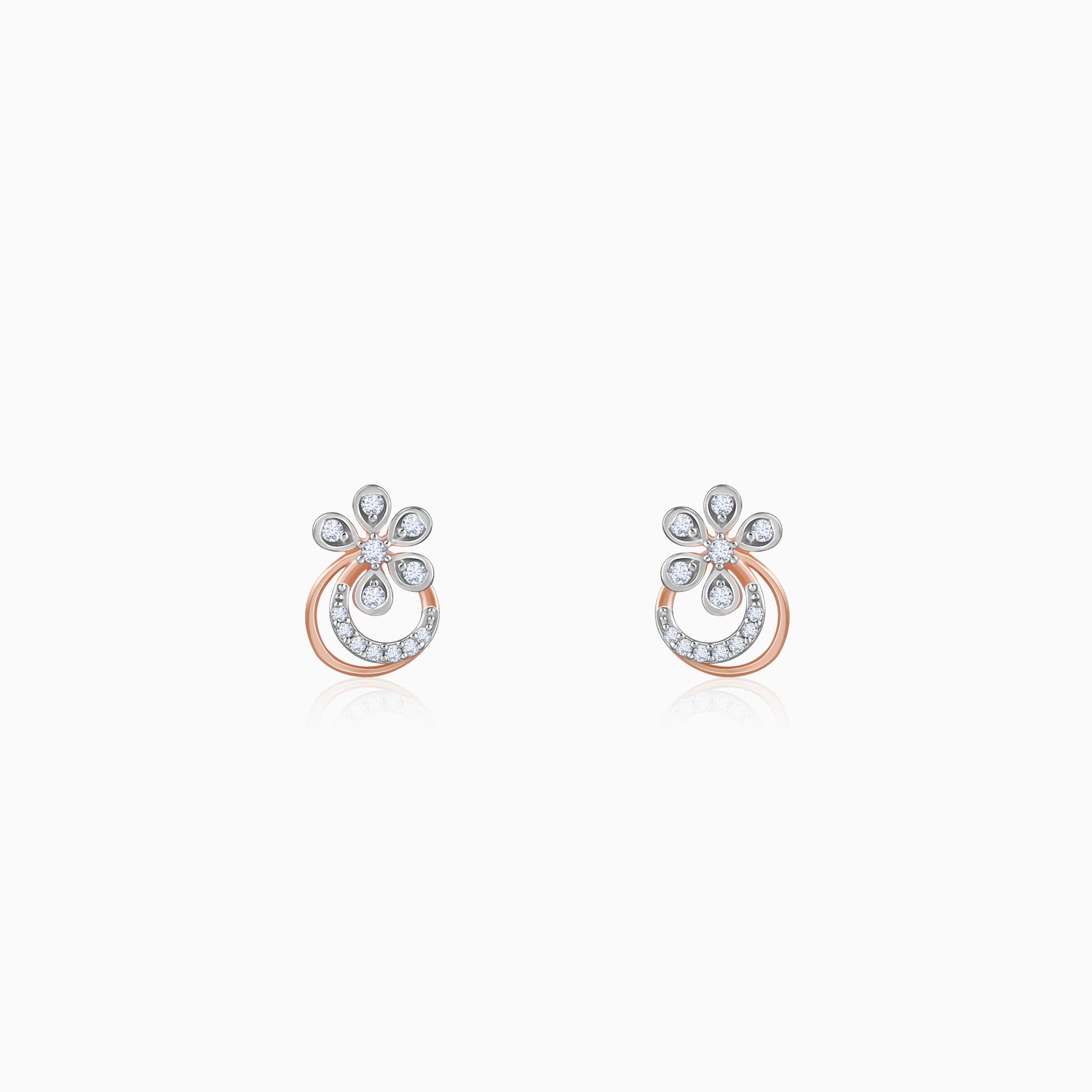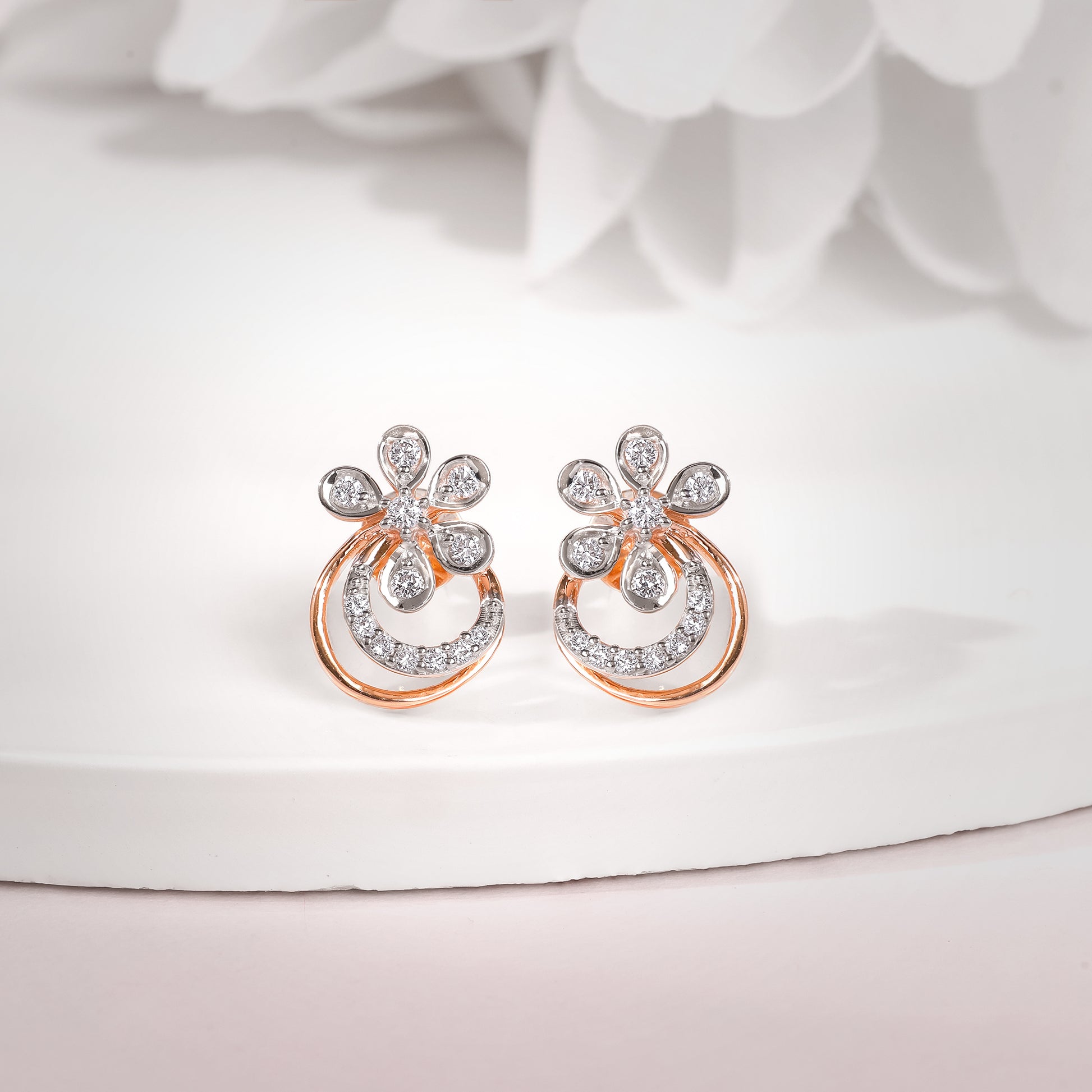These rose gold stud earrings for women features a graceful floral motif accented with lab grown diamonds. Two circular bands hang below—one in solid metal, the other embellished with shimmering lab grown diamonds.